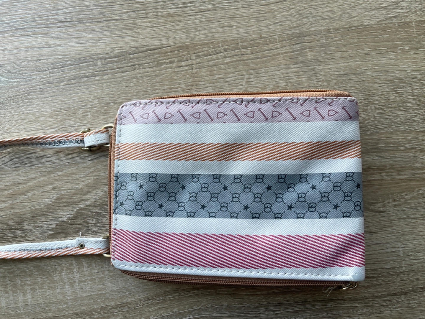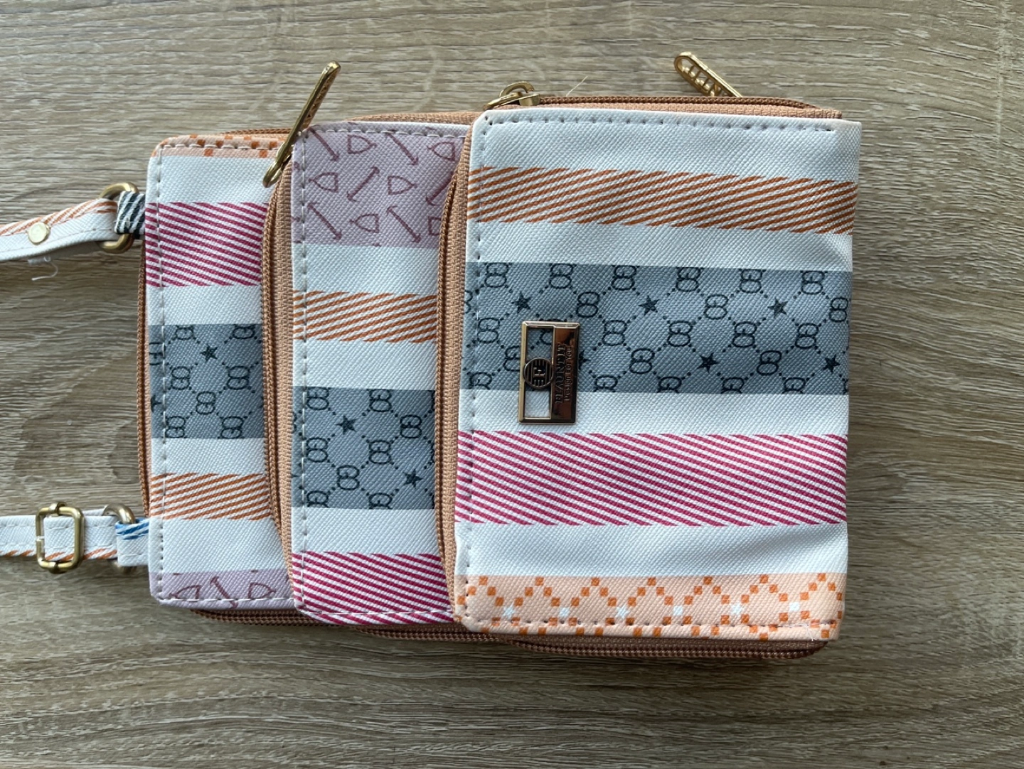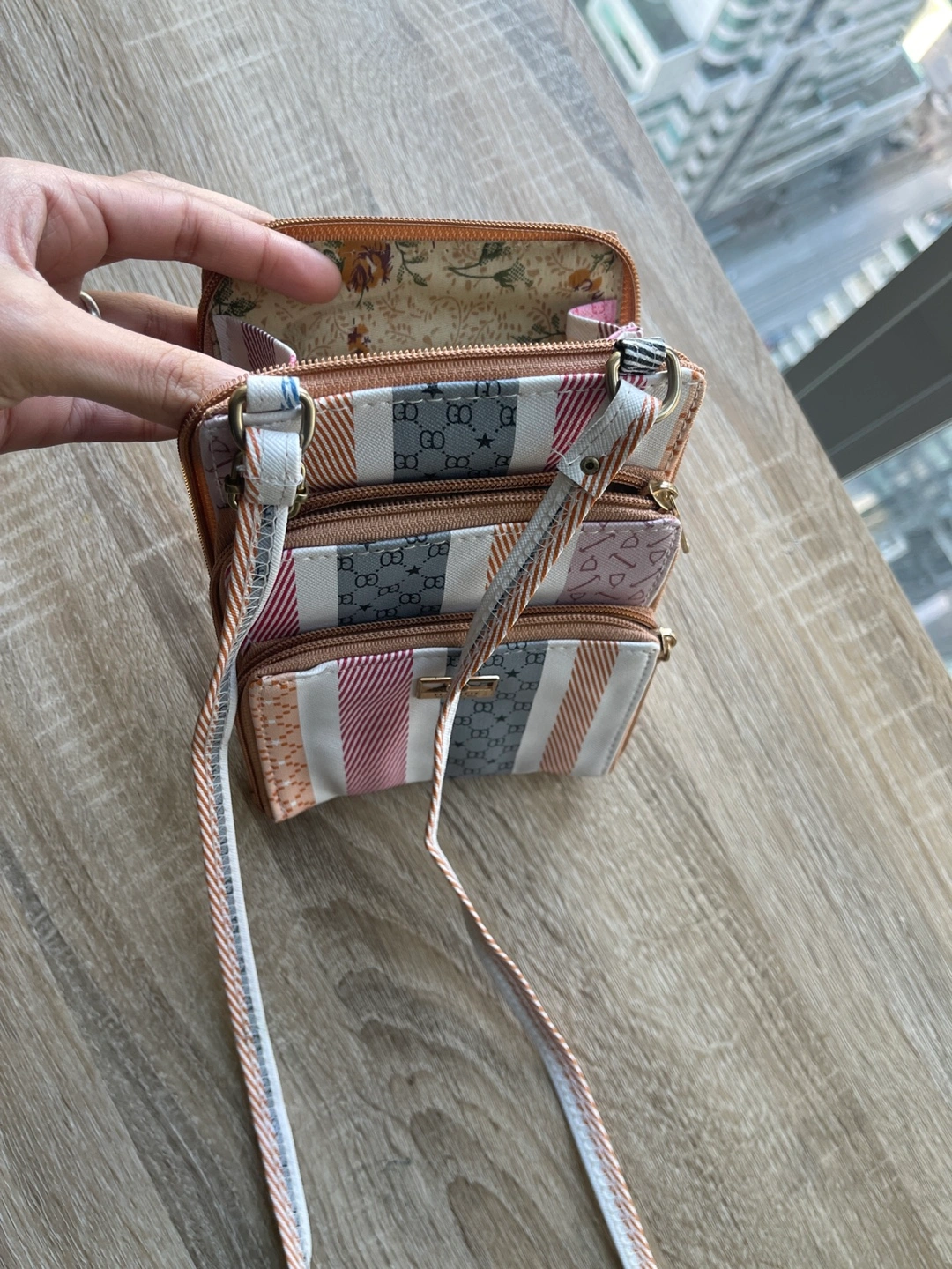 Adorable striped crossbody bag. Features multiple zippered compartments. Long adjustable strap. Perfect for everyday use.