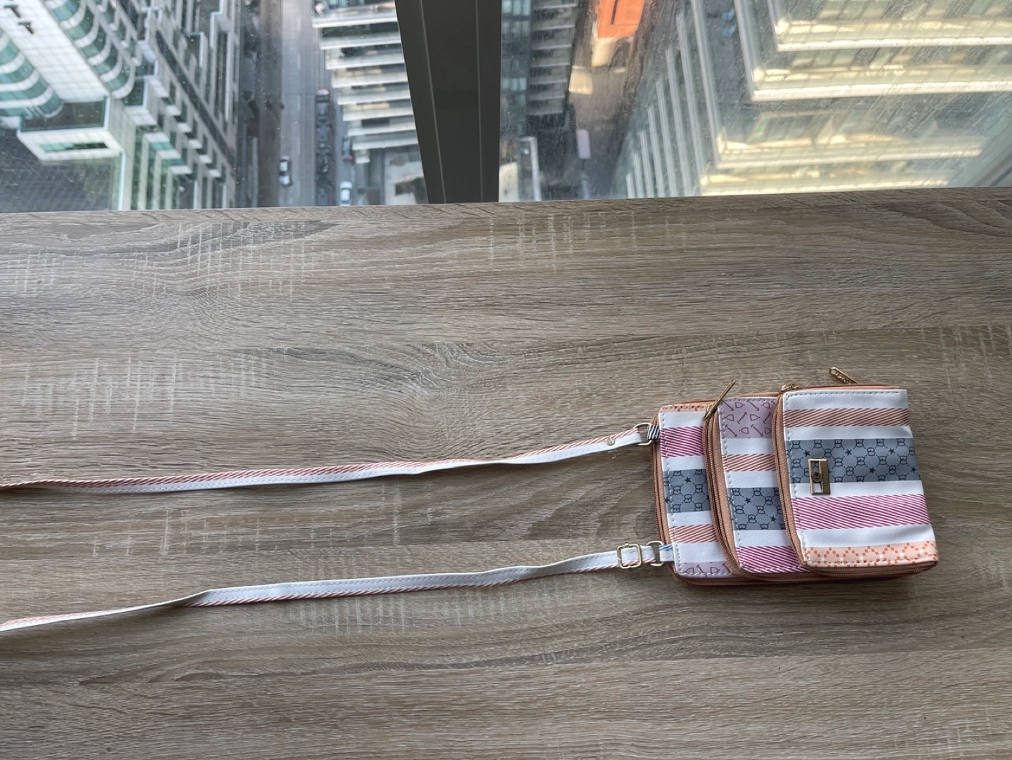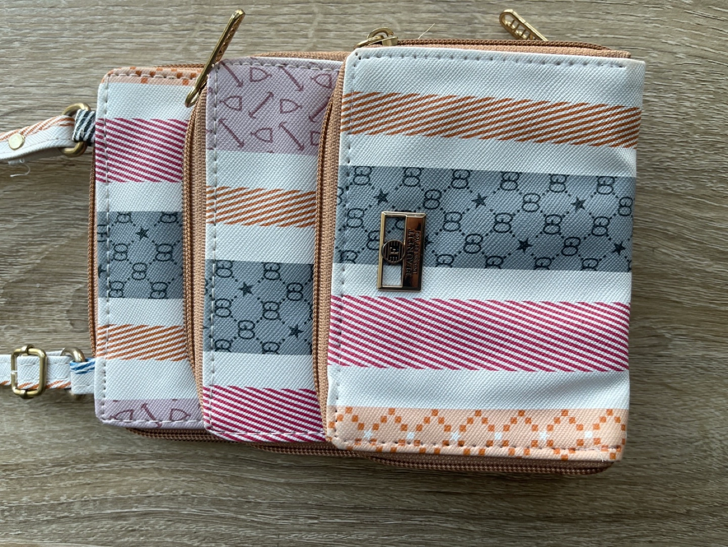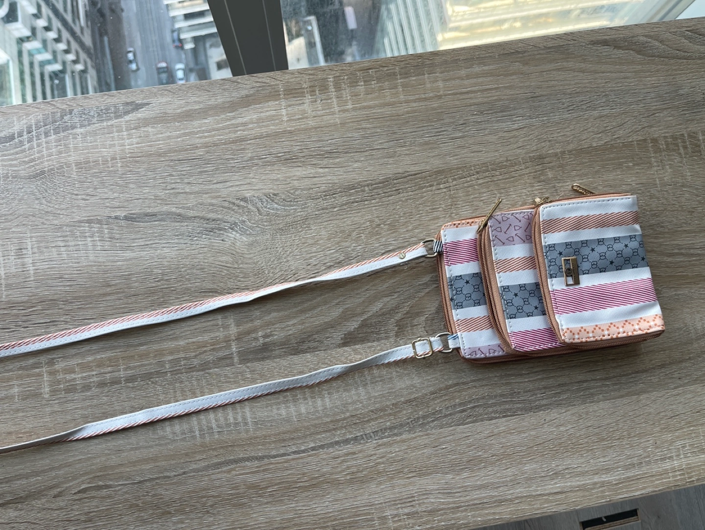 Adorable striped crossbody bag. Features multiple zippered compartments. Long adjustable strap. Perfect for everyday use.