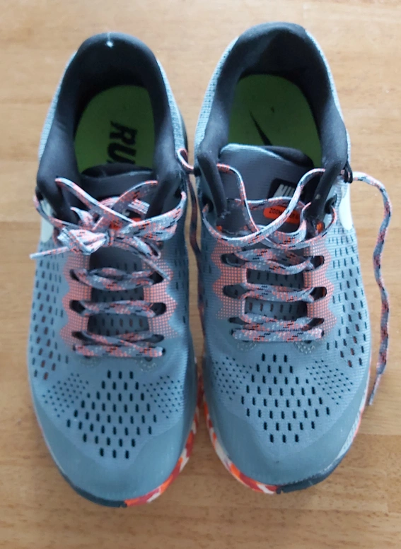 Grey and orange trail running shoes. Good condition. Durable outsole. Breathable upper. Lace-up closure.