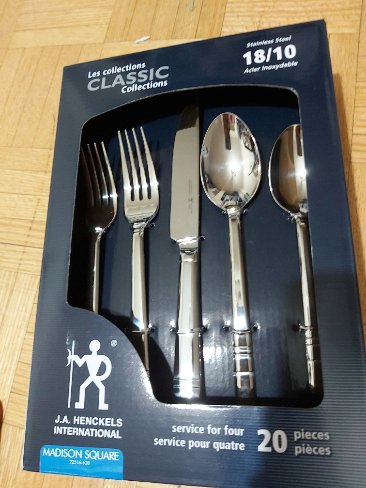 New in box, 20-piece stainless steel cutlery set. Service for four. Includes knives, forks, and spoons.