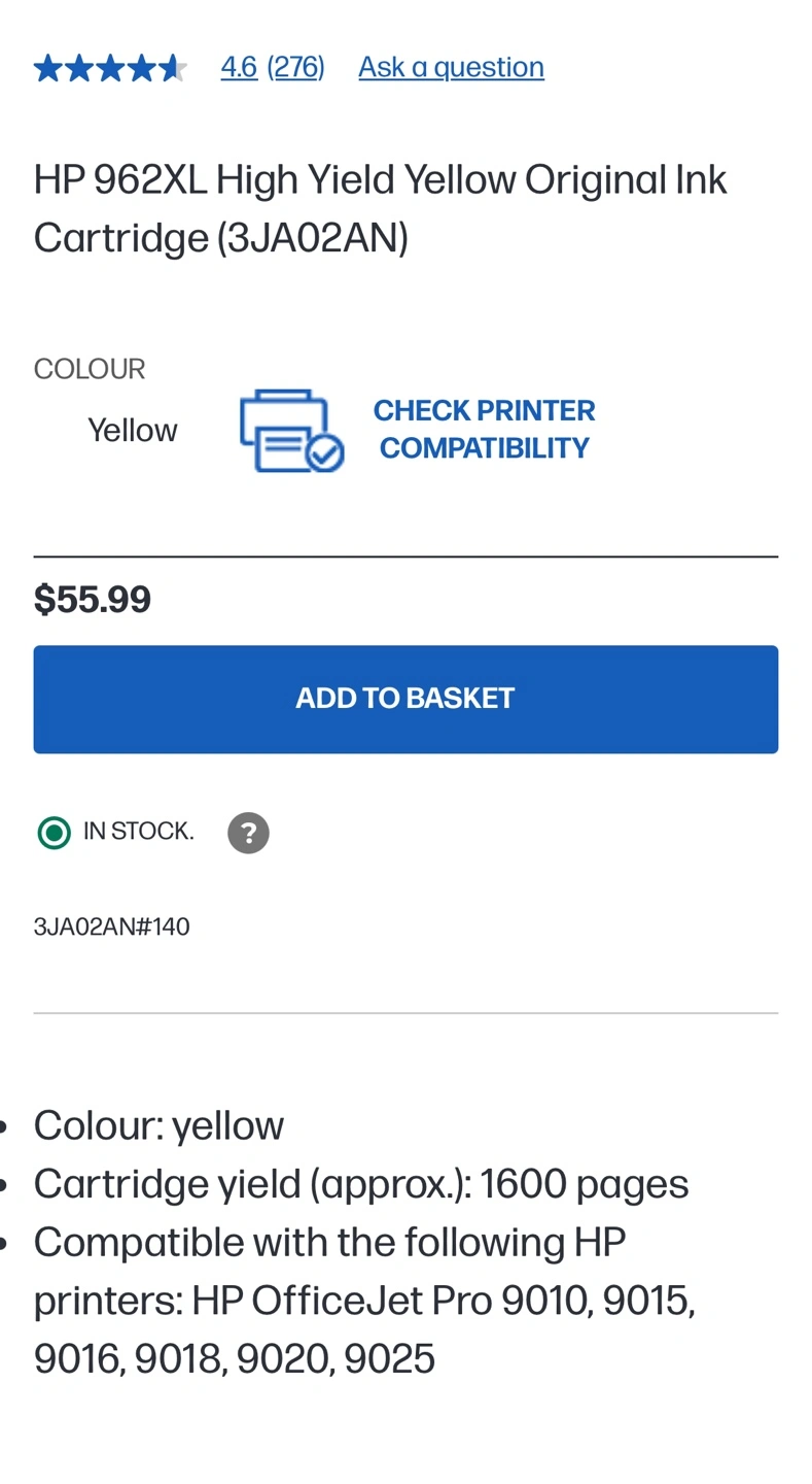 Original HP 962XL high yield yellow ink cartridge. Approximately 1600 pages. Compatible with HP OfficeJet Pro 9010, 9015, 9016, 9018, 9020, 9025 printers. In stock.
