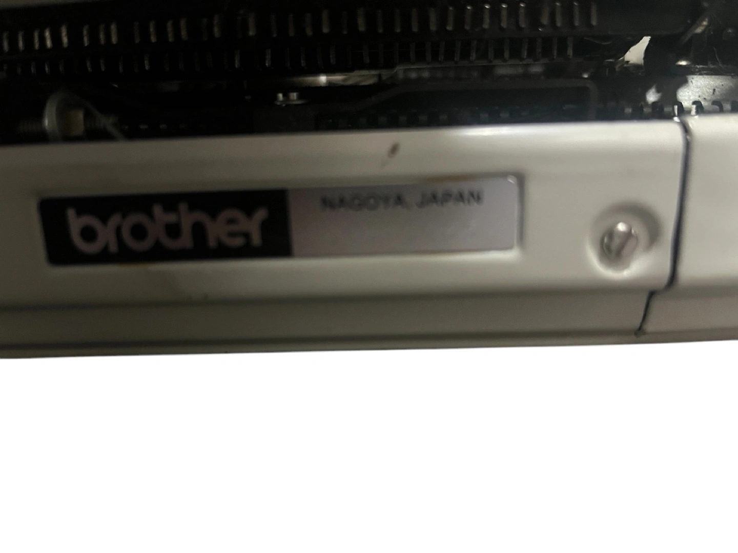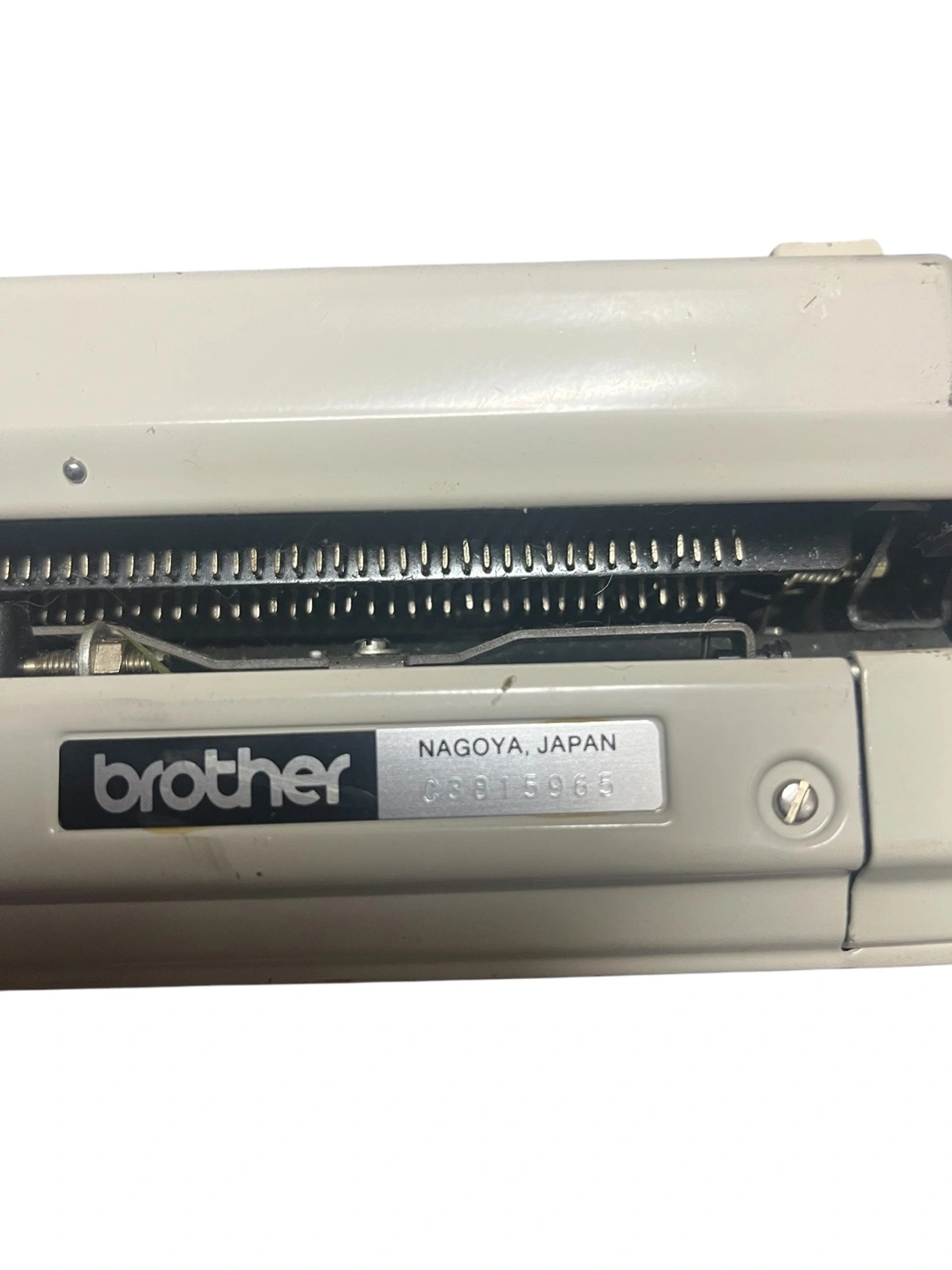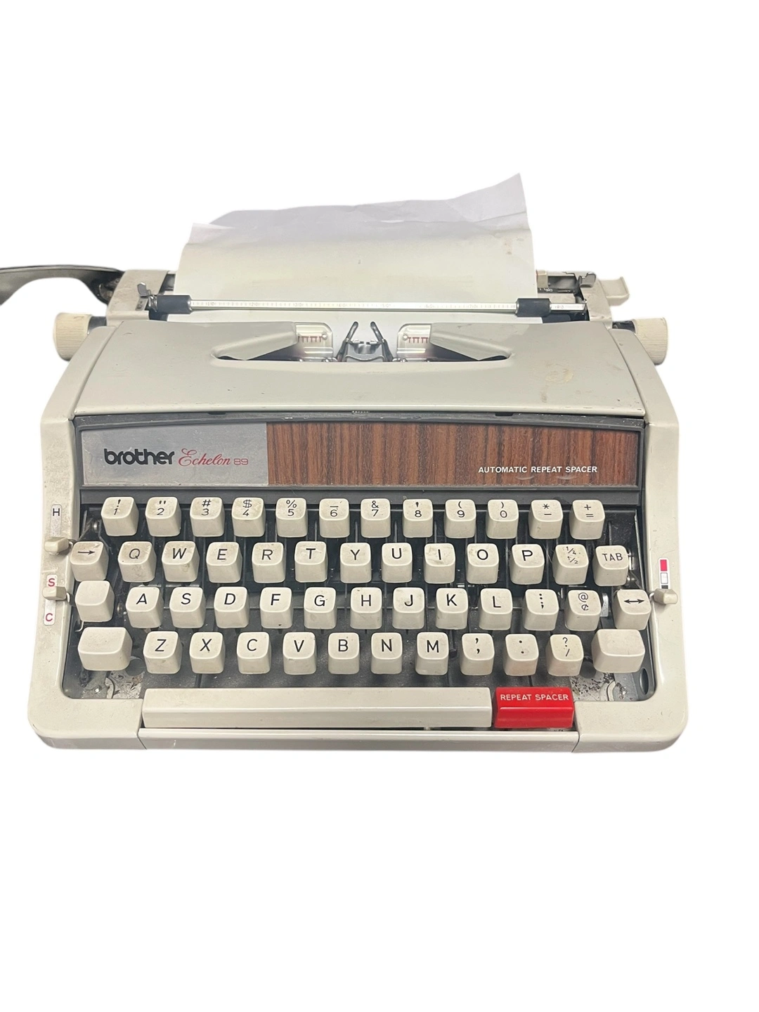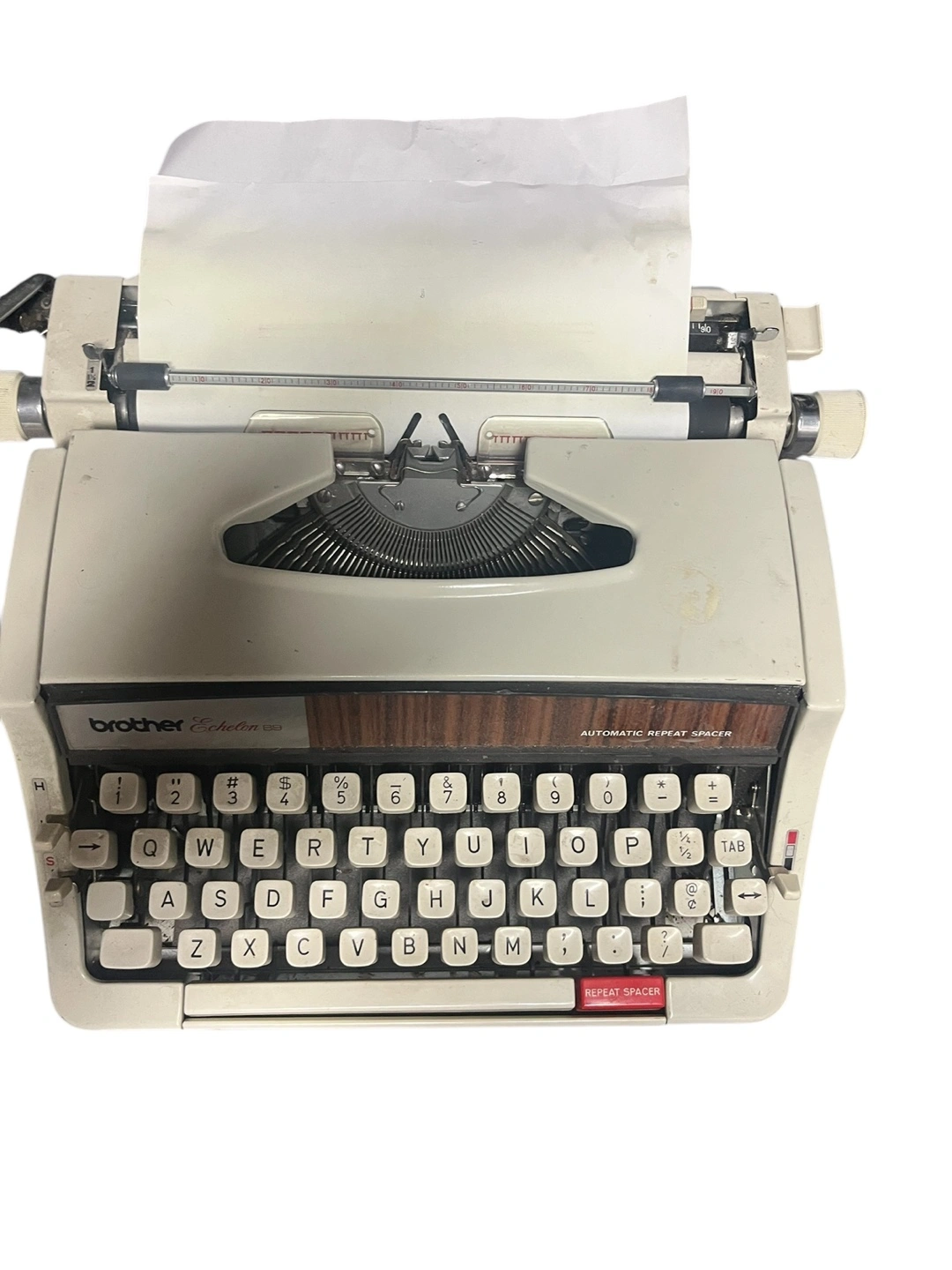 Vintage Brother Echelon 93 typewriter. Off-white body with brown accents. Automatic repeat spacer. Made in Nagoya, Japan.