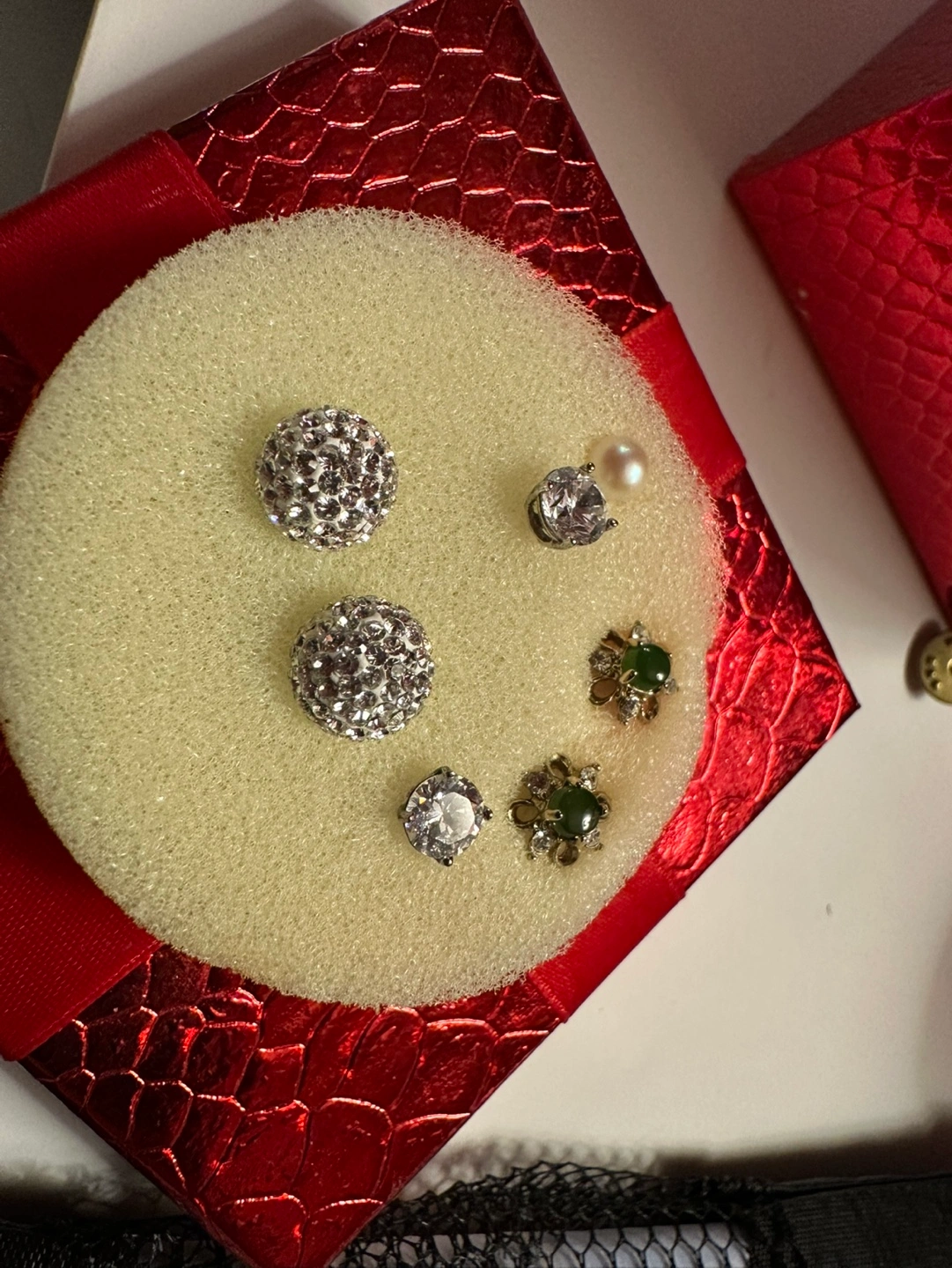 Set of five pairs of earrings. Three pairs feature clear stones, one pair has a pearl accent, and one pair features green stones. Presented in a red box.