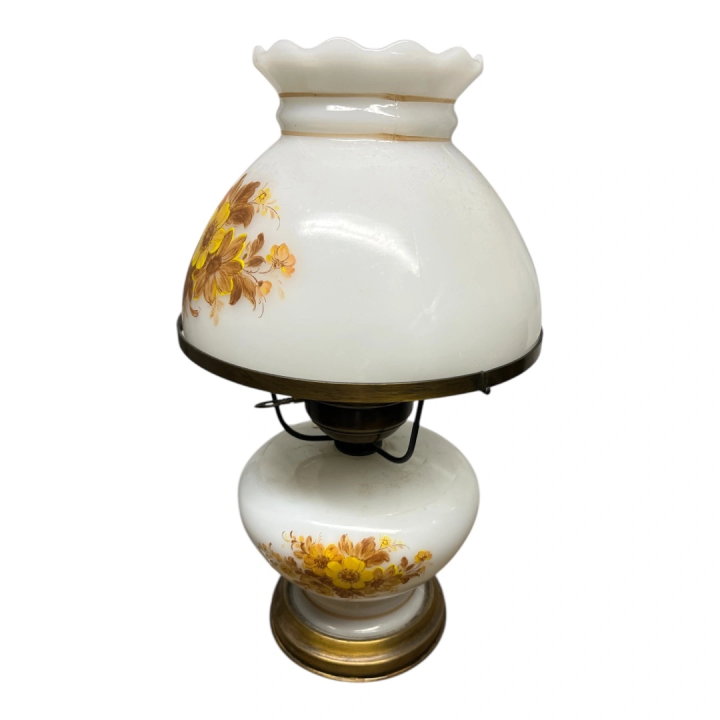 Beautiful vintage table lamp. Milk glass base and shade. Features a floral design in shades of yellow and brown. Brass coloured accents. Adds a touch of retro charm to any space.