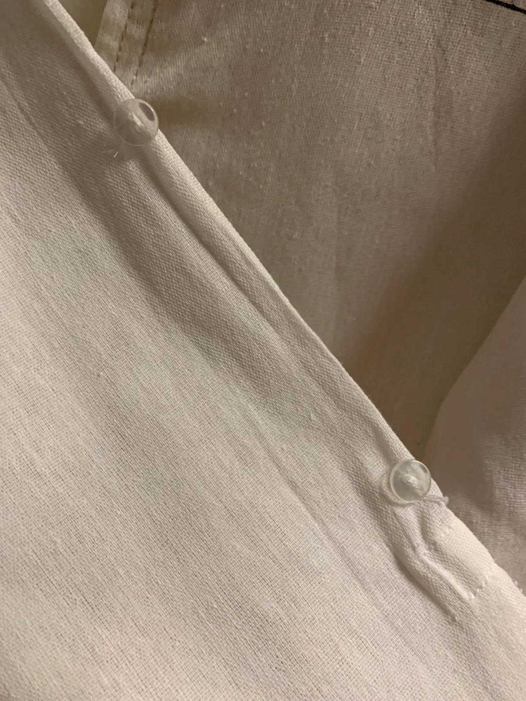 Not 100% sure of the fabric, but looks like linen. Slightly sheer.