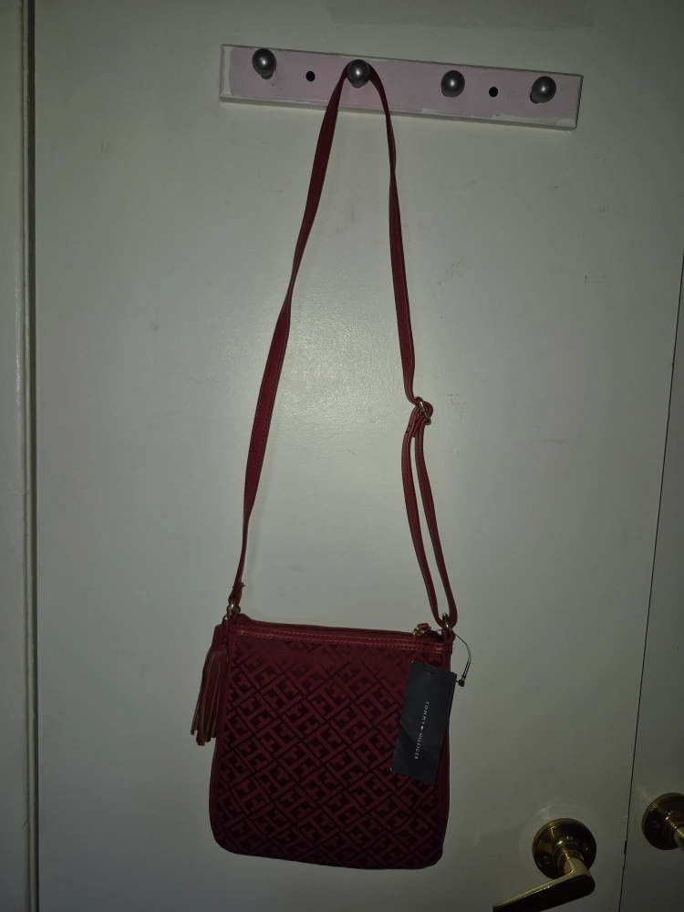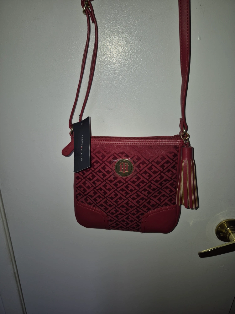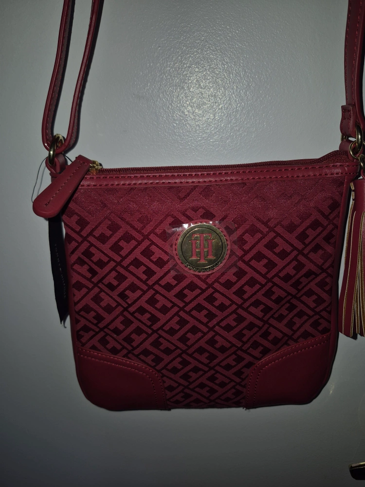 Burgundy crossbody bag. Features a patterned design, gold-toned hardware, and a tassel accent. Adjustable strap. New with tag.