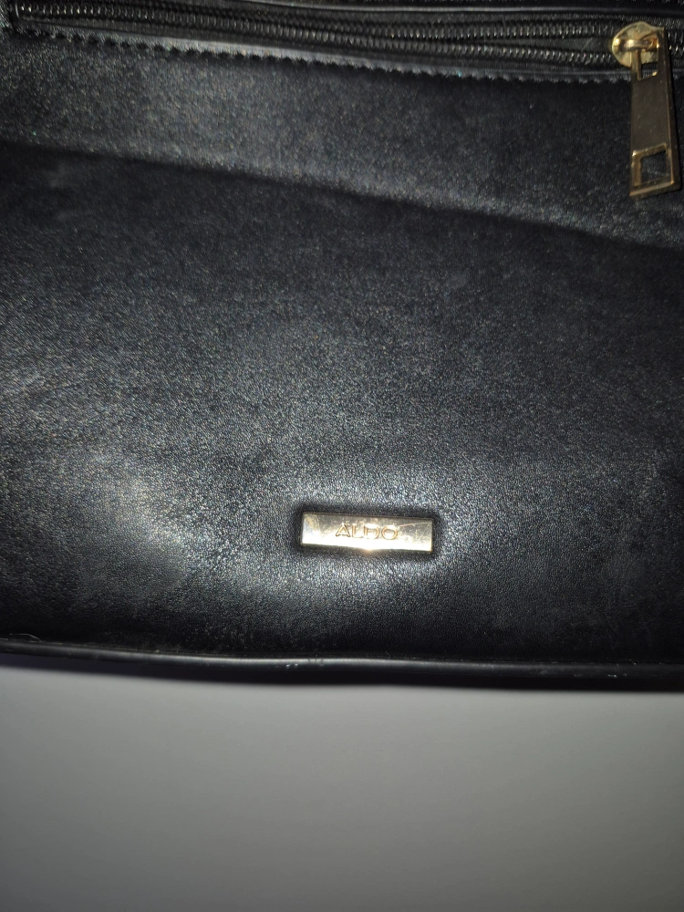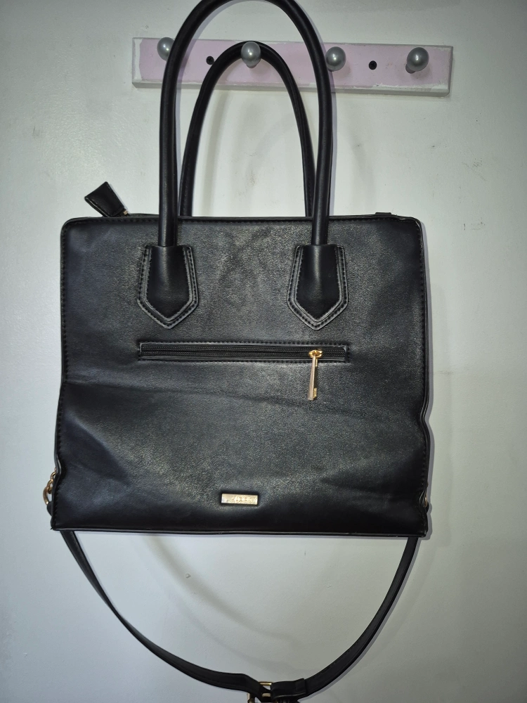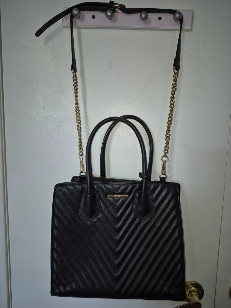 Stylish black handbag. Features a quilted design, gold-tone hardware, double top handles, and a detachable gold chain strap. Zipper closure. Interior details not shown.