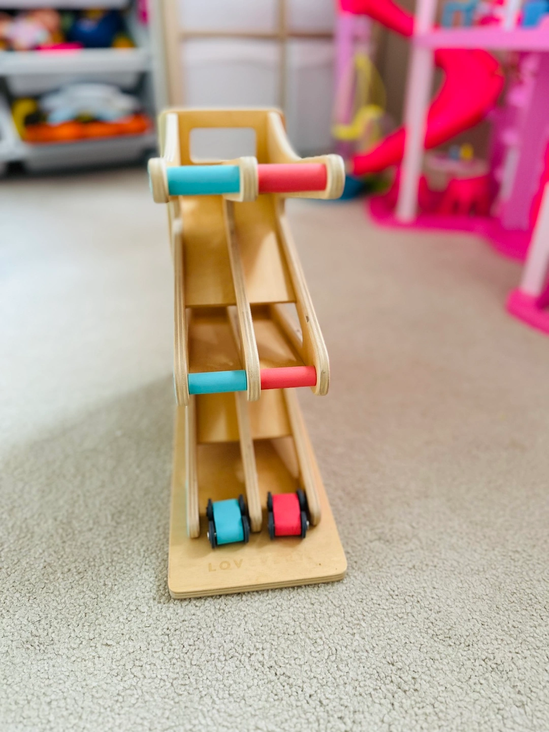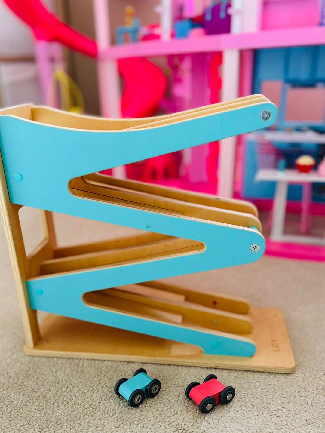 Adorable three-level wooden car ramp. Includes two small toy cars. Light blue and natural wood finish. Great for imaginative play.