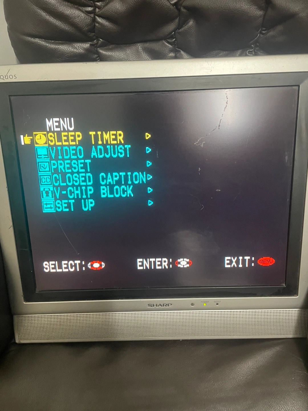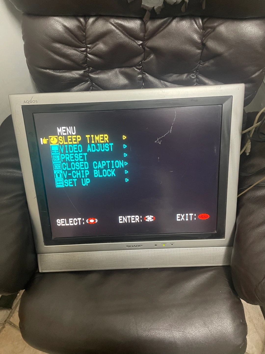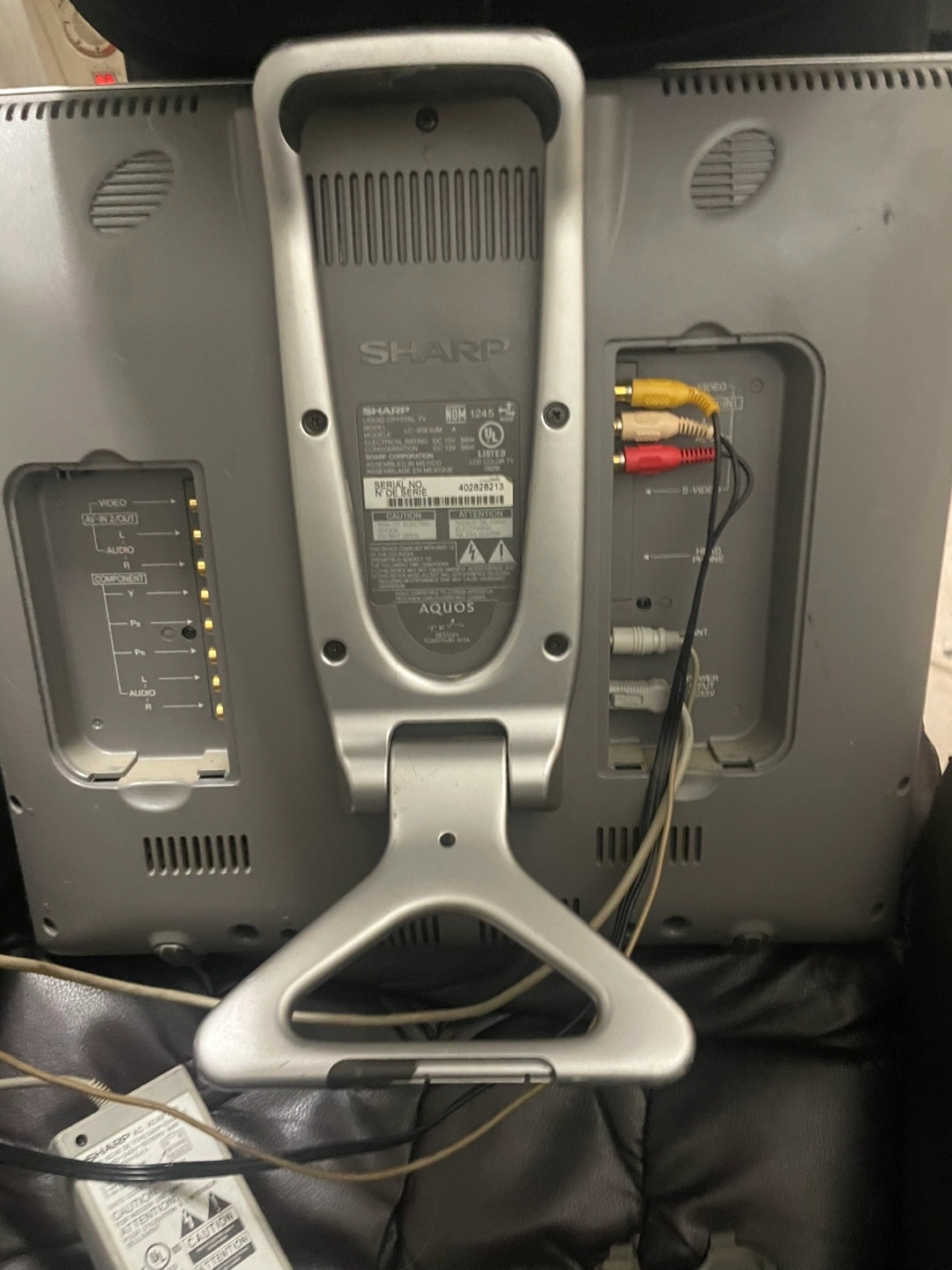 Used Sharp Aquos LCD TV. Silver color. Includes power cord and other cables. Small screen scratches visible. Functional condition unknown.