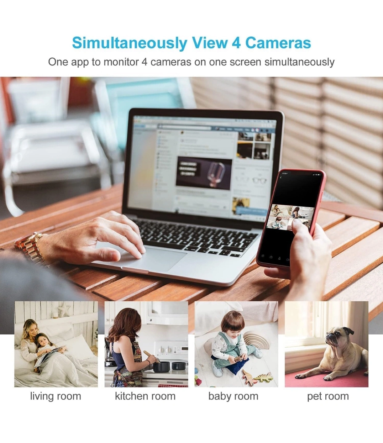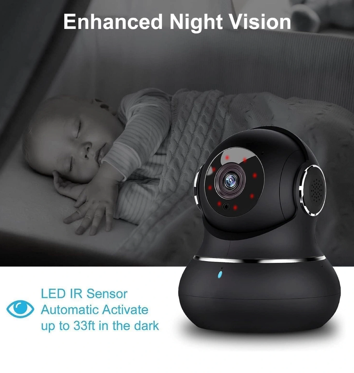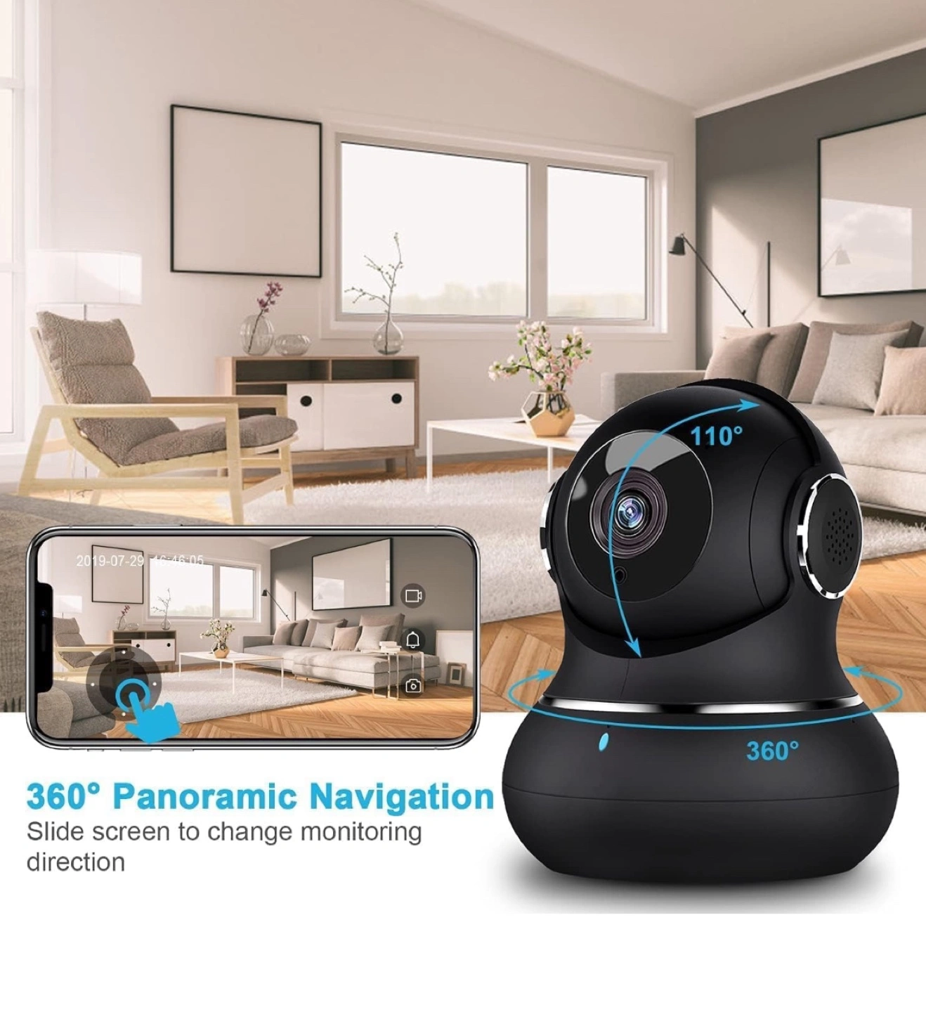 Wireless home security camera. Features 360° panoramic view, night vision up to 33ft, and two-way audio. Monitor up to four cameras simultaneously via app. Compatible with iOS and Android.