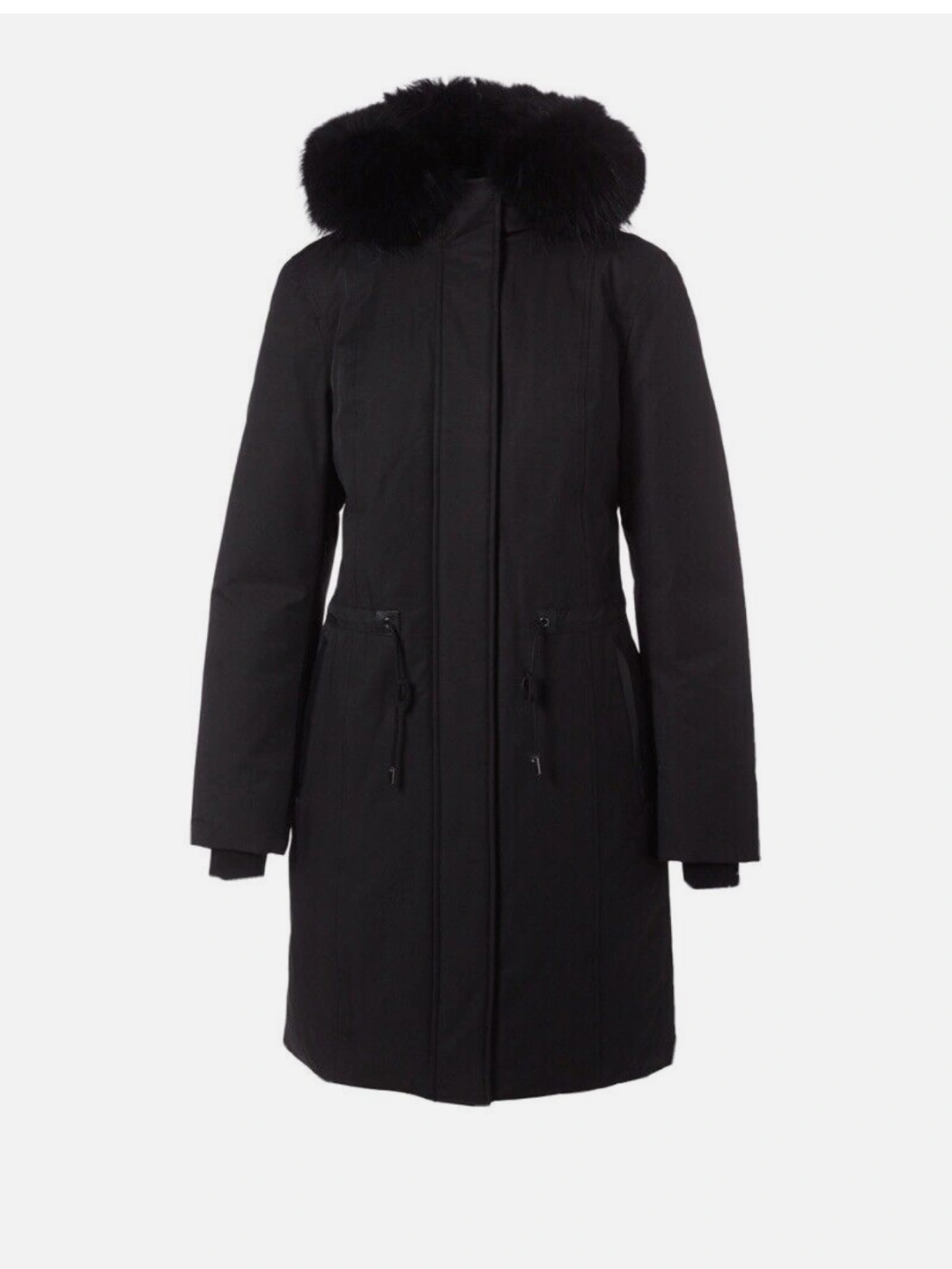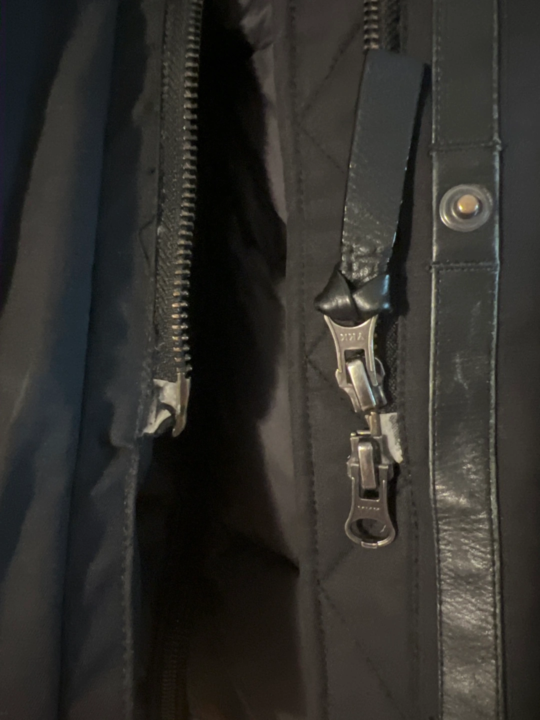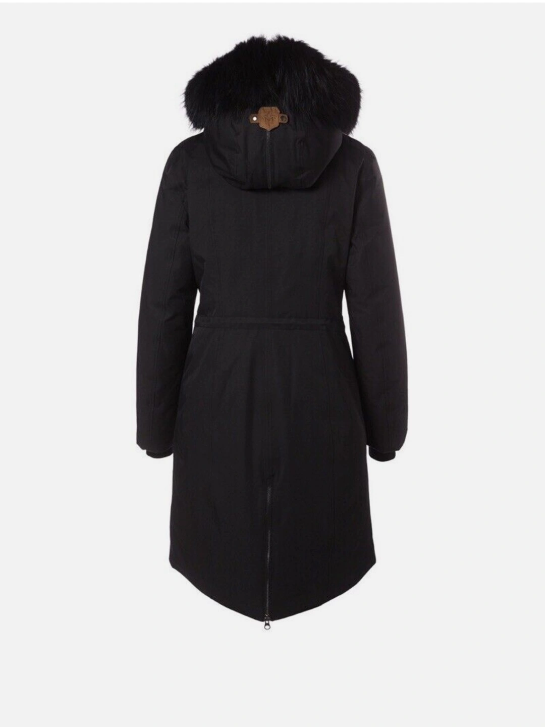 Black coat with black fur. The fur lines the whole hood so it’s incredibly warm. It was used for two seasons so does have signs of wear but overall good condition with loads of life left. There is wear on the seams under the arms and the plastic in the zipper is chipping, but the zipper is still fully functional and I don’t have any issues doing it up. I’ve tried to picture all the signs of wear.