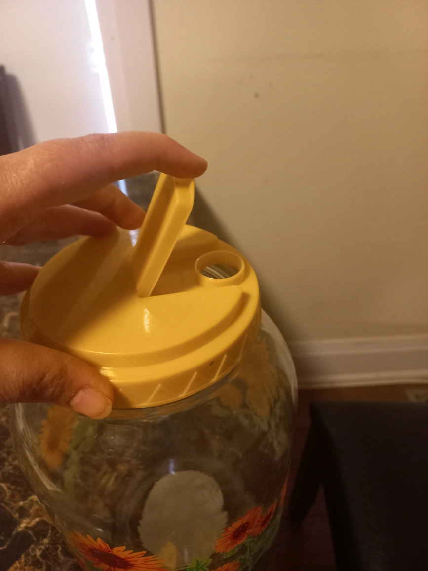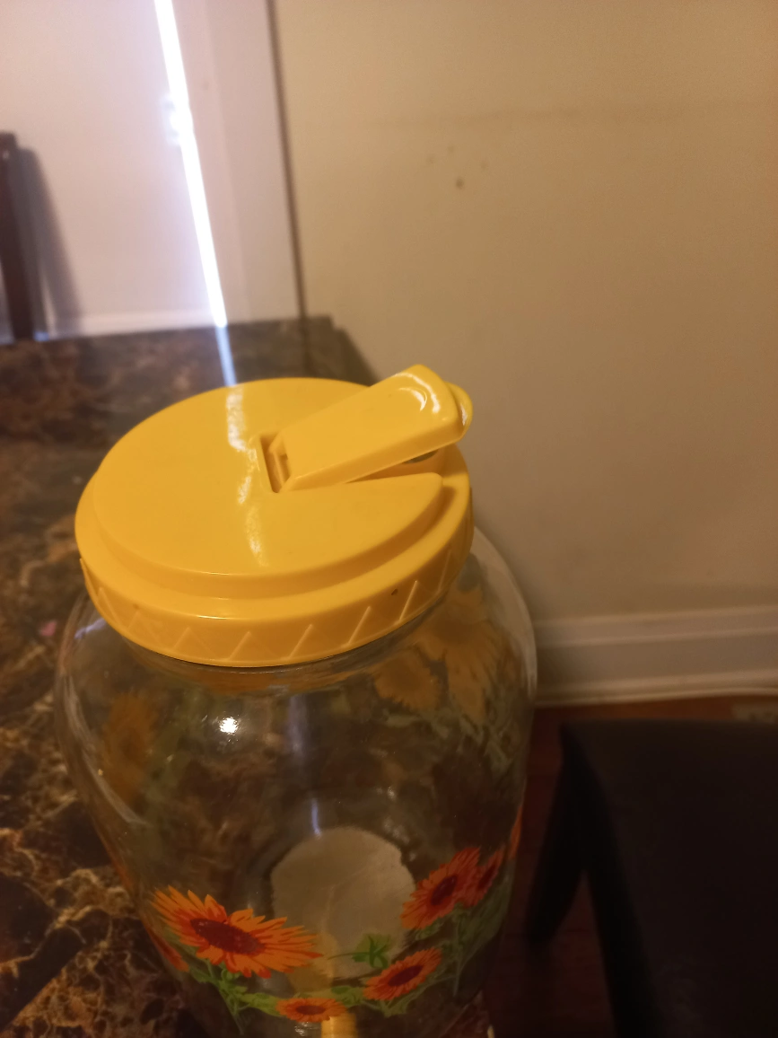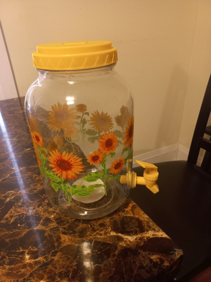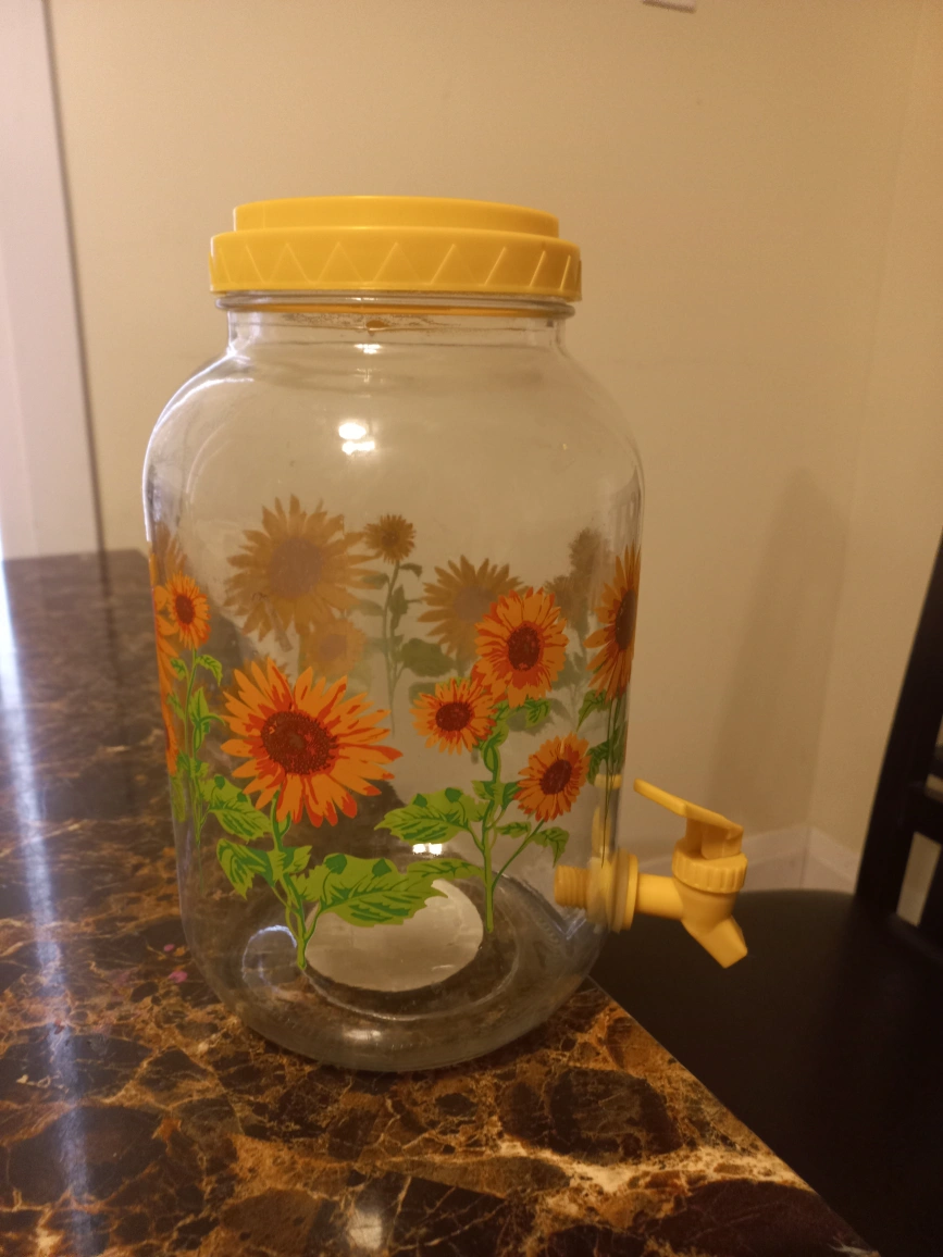 Glass beverage dispenser. Features a sunflower design and yellow plastic lid and spout. Perfect for serving drinks. 4L capacity