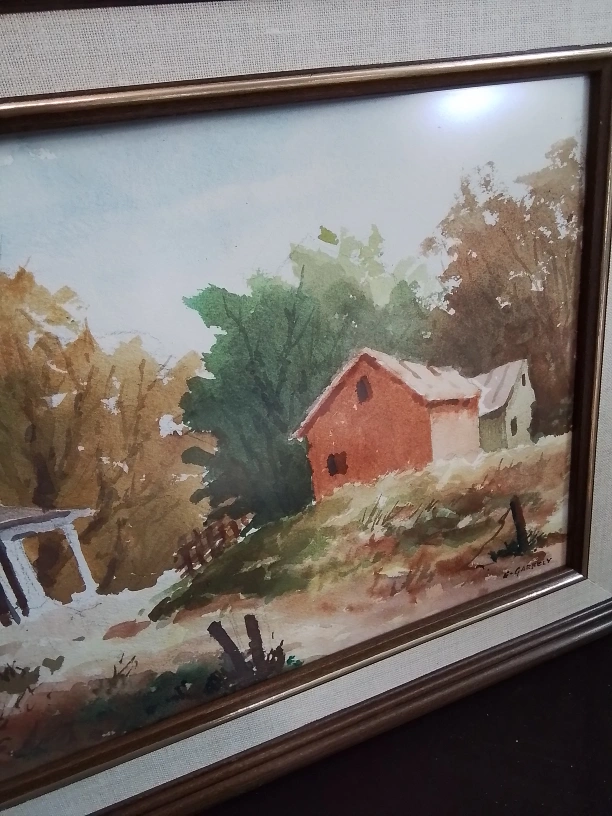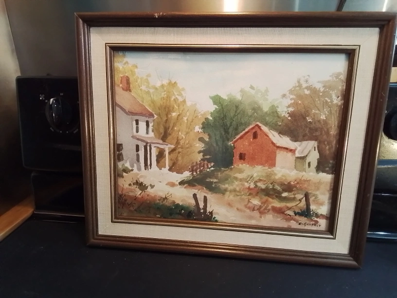 Watercolour on paper. This artwork depicts a rural landscape with two houses, the larger a two-story structure with a porch and chimney, the smaller a connected shed-like building, all set amongst a backdrop of autumnal trees in shades of yellow and green, with a low-lying field in the foreground. Signed Edward Garbely on bottom right corner. Attributed to Edward Garbely (1908 - 1999). 11.25 inch x 15 inch. Measurements 17.75 x 14.75. Provenance: Private collection, Ohio, United States. Estimate 150.00 - 300.00 USD