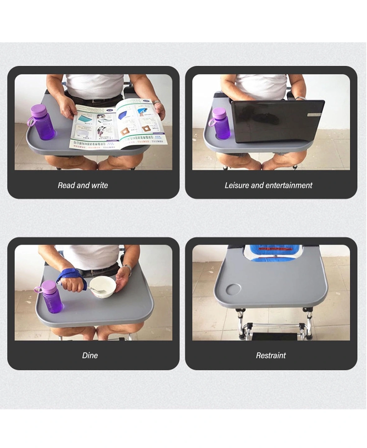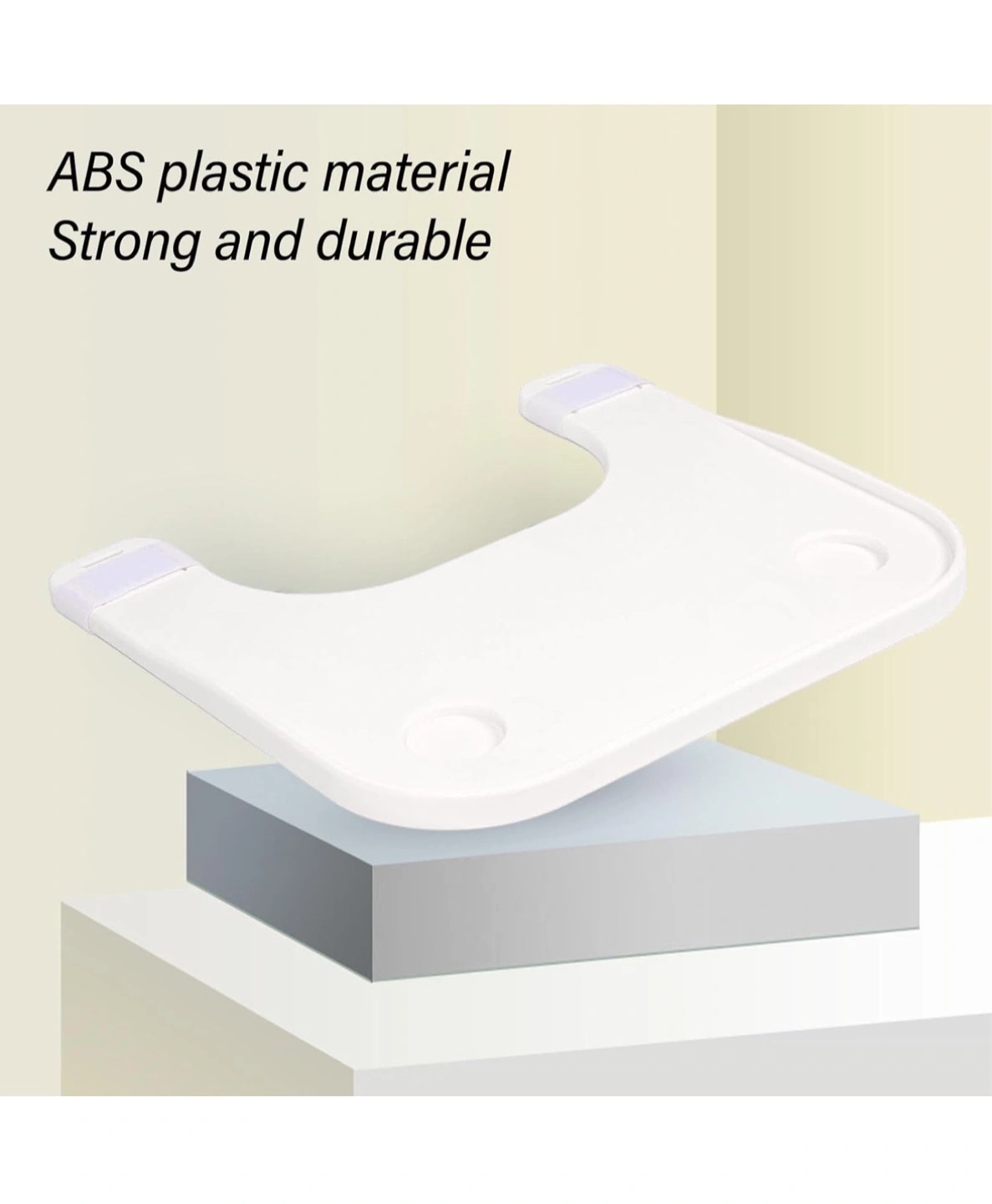Durable ABS plastic. Attaches to chair or wheelchair. Two cup holders. Great for eating, reading, or working.