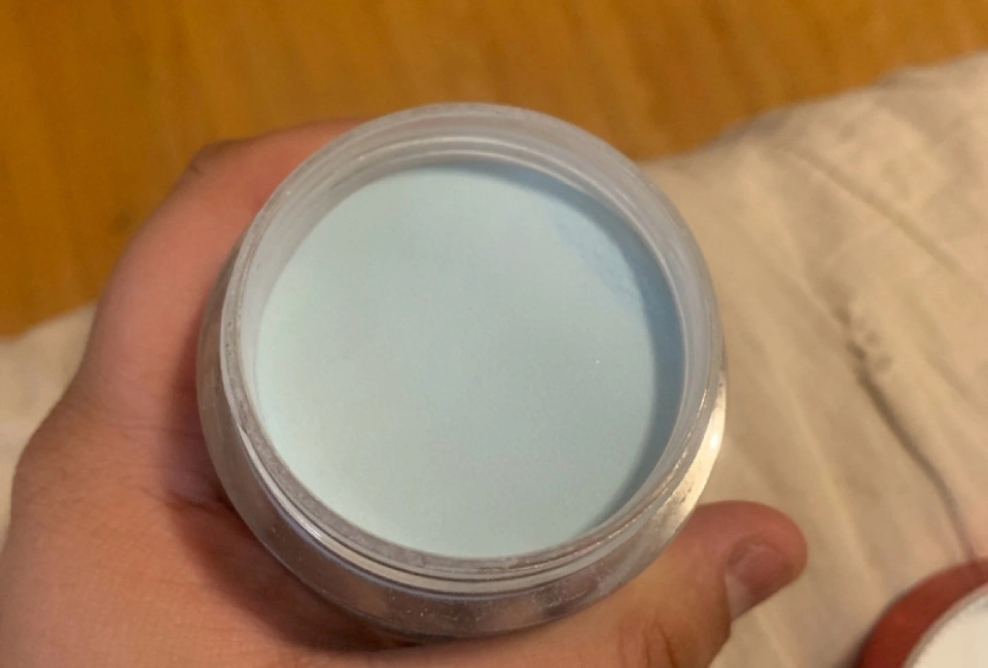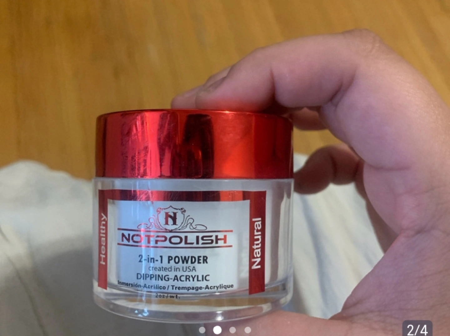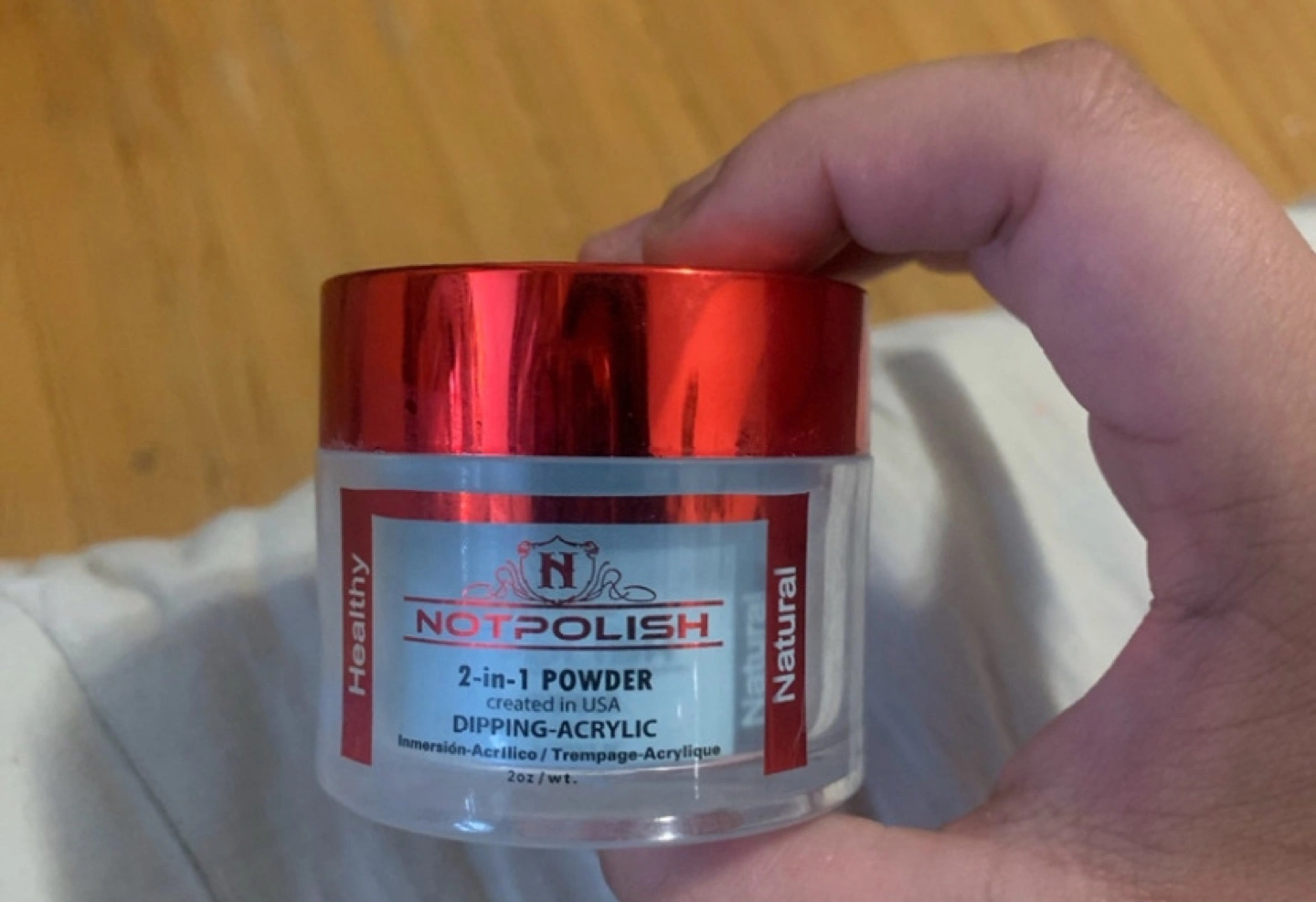 Two pots of NOTPOLISH 2-in-1 dipping powder. One pot is natural white, the other is light blue. 2oz each.