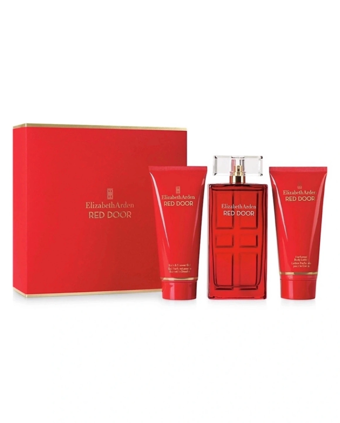 The glamorous, elegant and sophisticated 3-Piece Set contains Red Door Eau de Toilette Spray, Red Door Perfumed Body Lotion and Red Door Bath & Shower Gel.