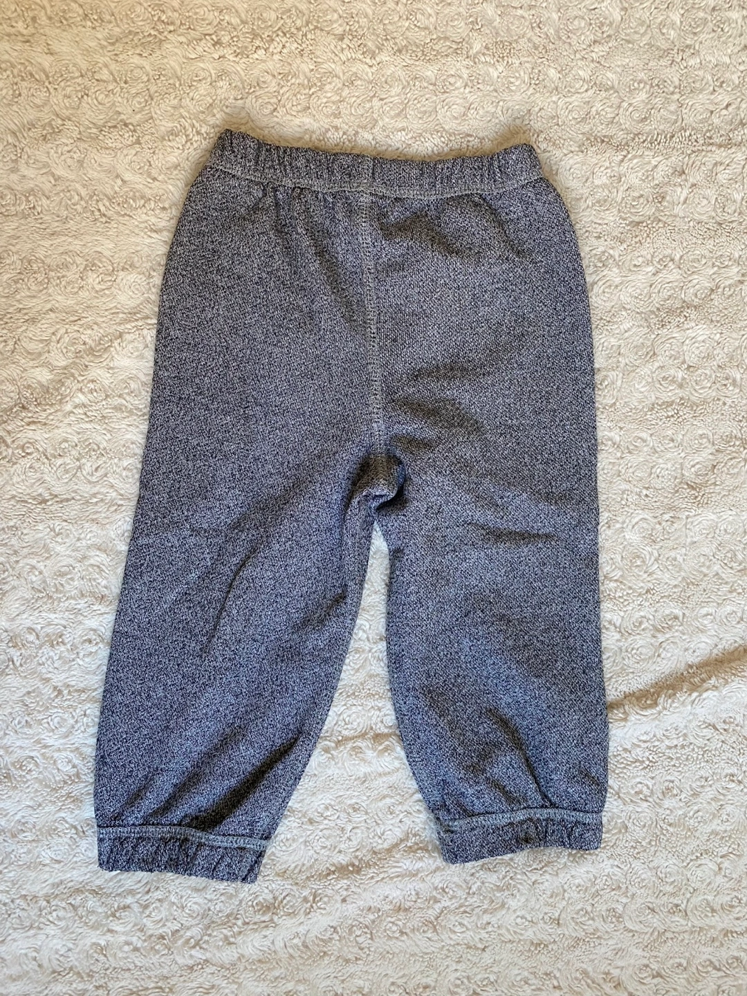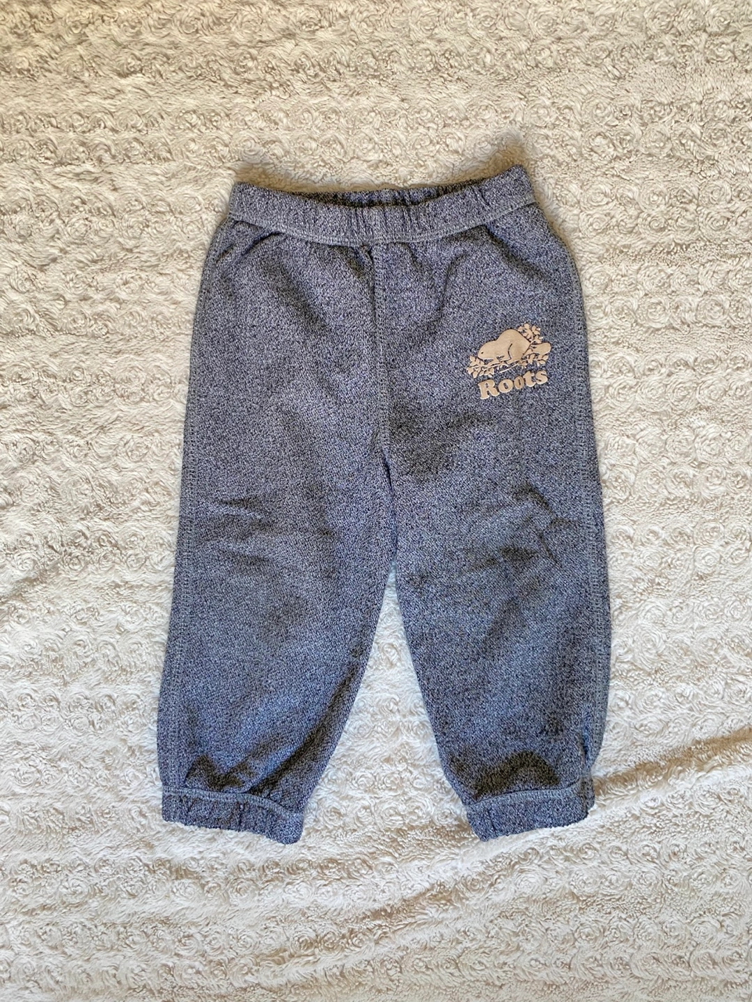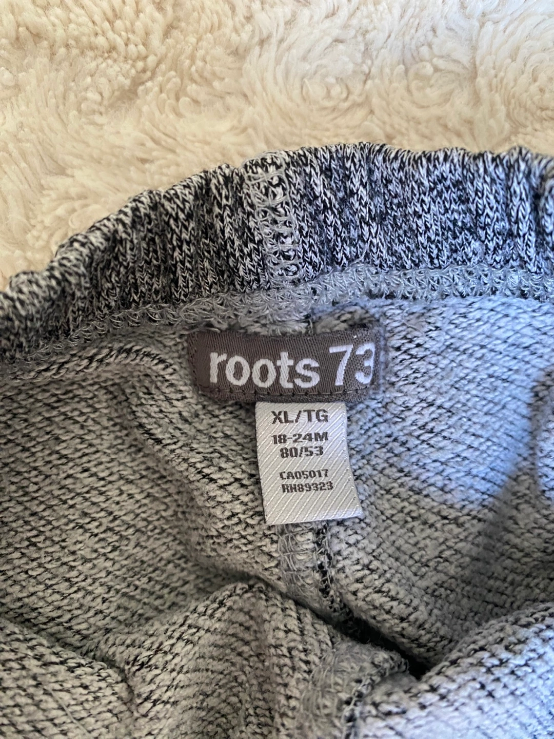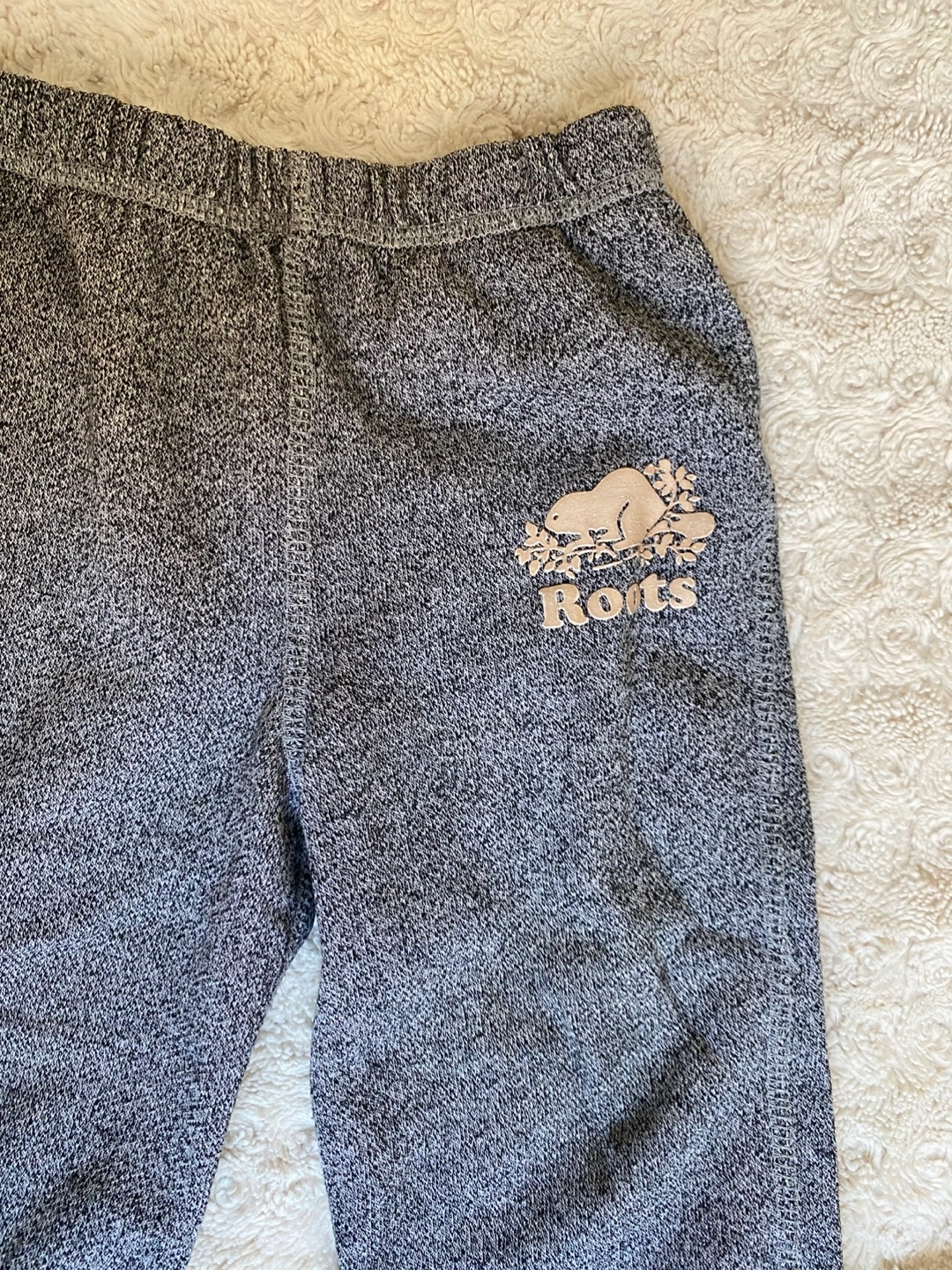 610Adorable unisex baby joggers in salt and pepper. Elastic waistband. Features the iconic Roots beaver logo. Size XL/TG (18-24 months). Gently used.