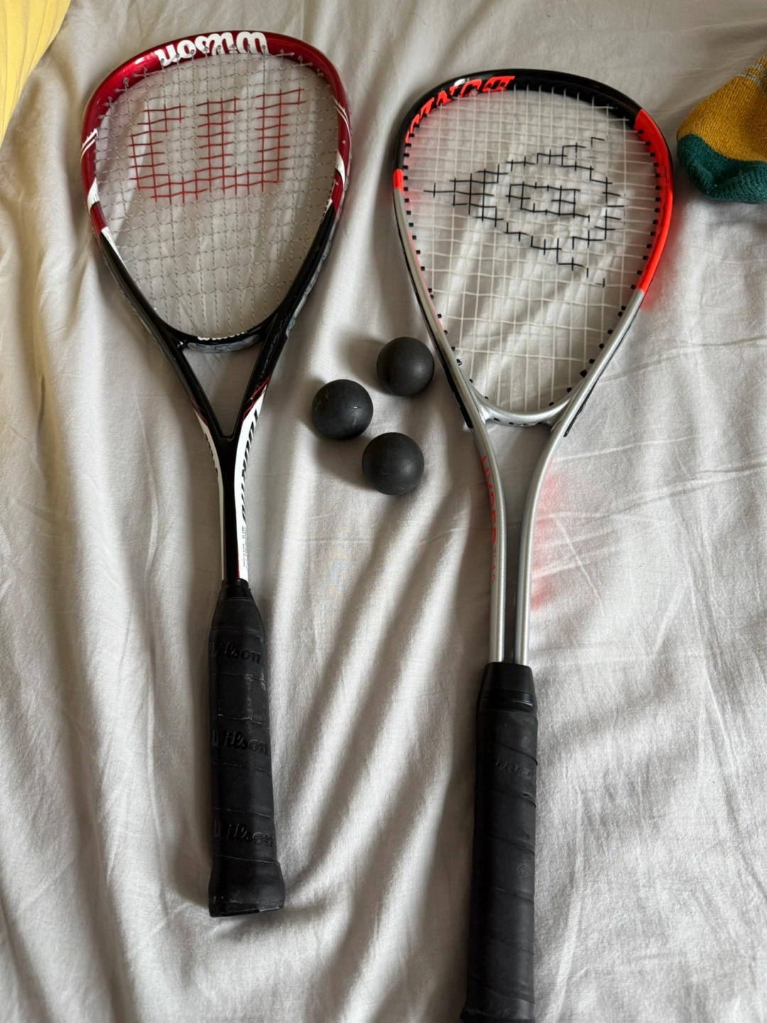 Two used squash racquets, one Wilson brand. Three squash balls included. Good condition.