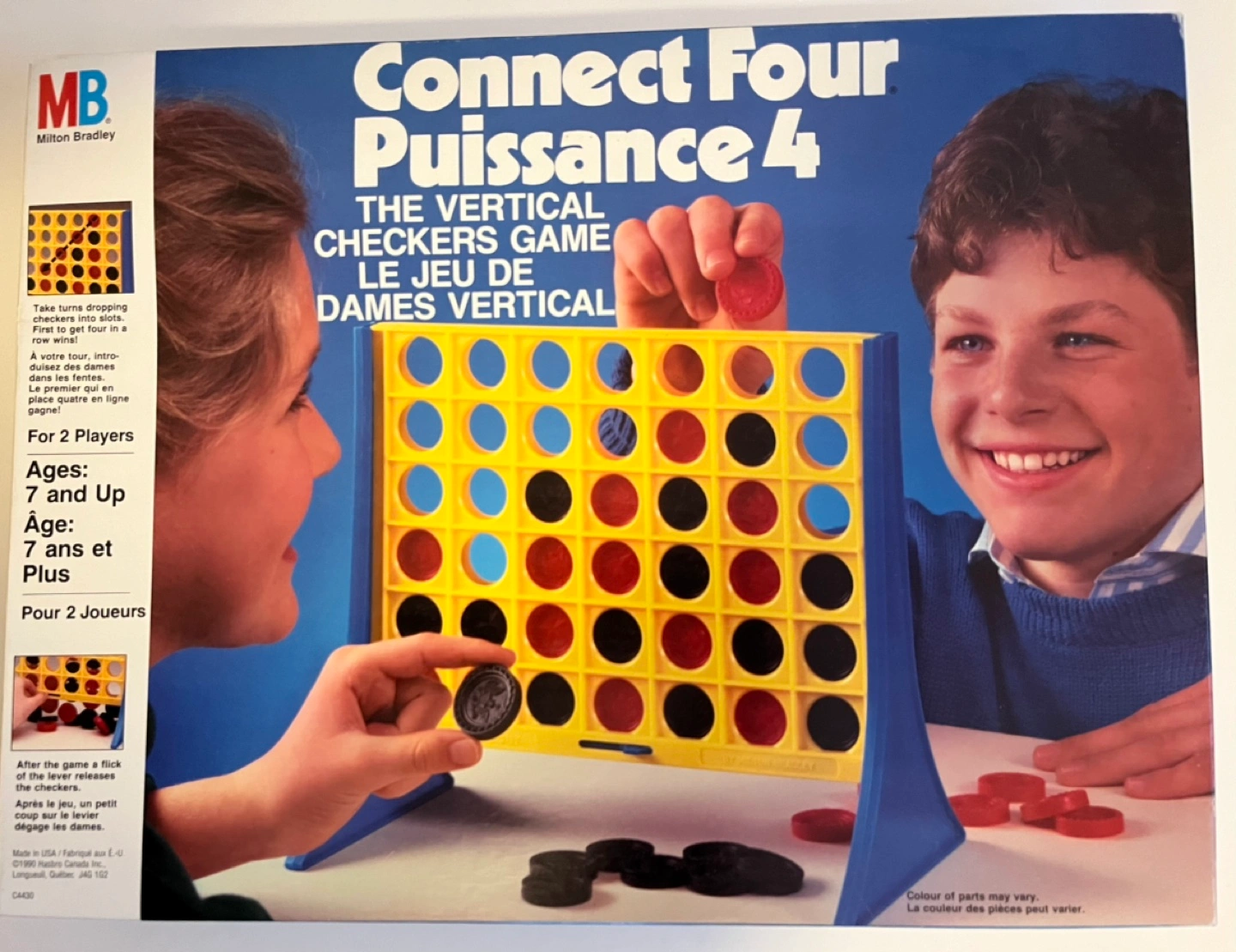 Connect Four is a vertical checkers game for 2 players. Player try to build a row of 4 checkers while keeping the opponent player from doing the same. Box includes a grid, 2 end supports, 21 black checkers. 21 red checkers and instruction sheet. Manufactured by Milton Bradley. Like new condition. If ad is up, the item is available.