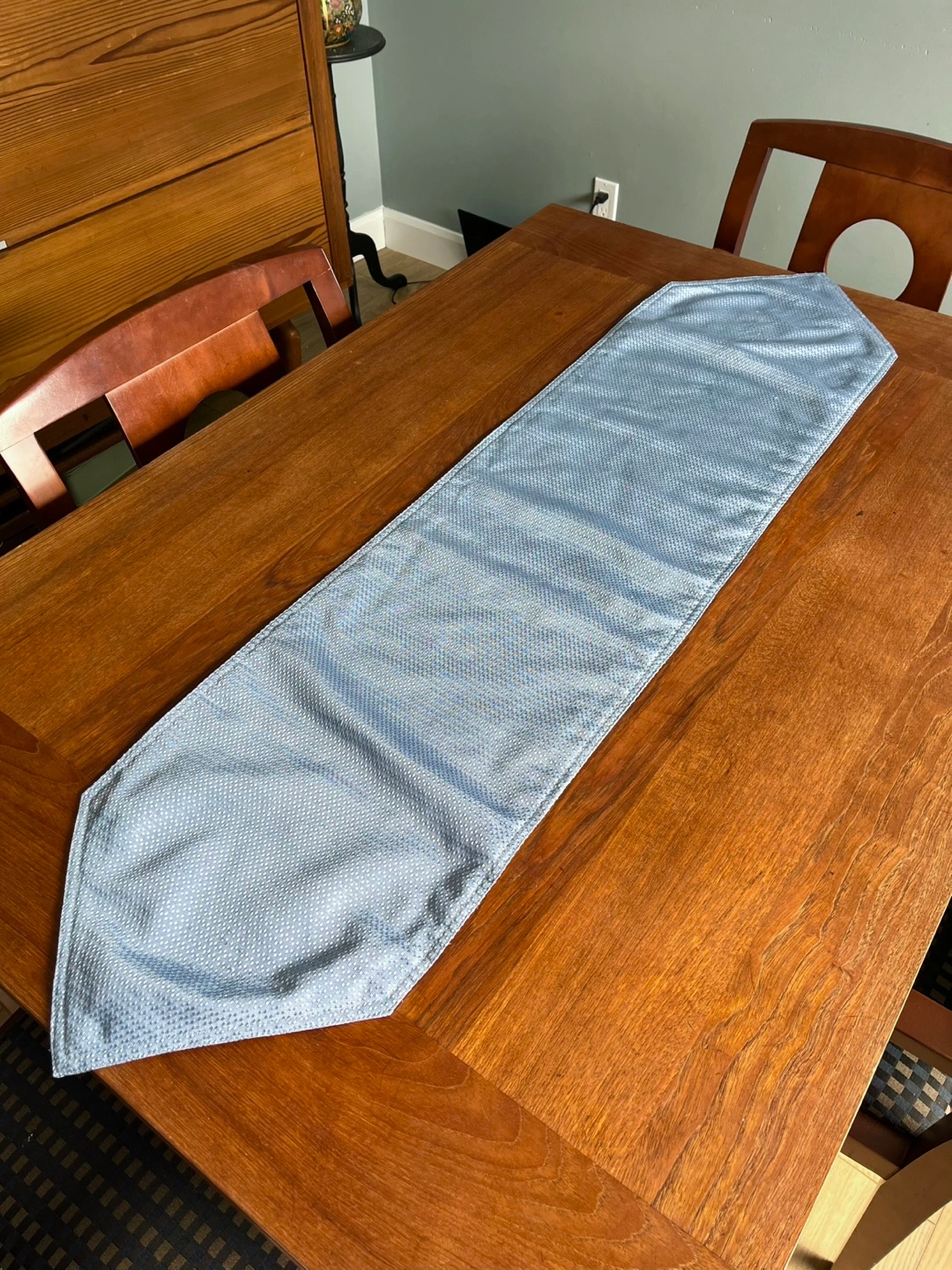 Light blue table runner. Woven fabric. Subtle textured pattern. Good condition - no stains. There are a couple pulled threads in the stitching pattern, but nothing very noticeable.