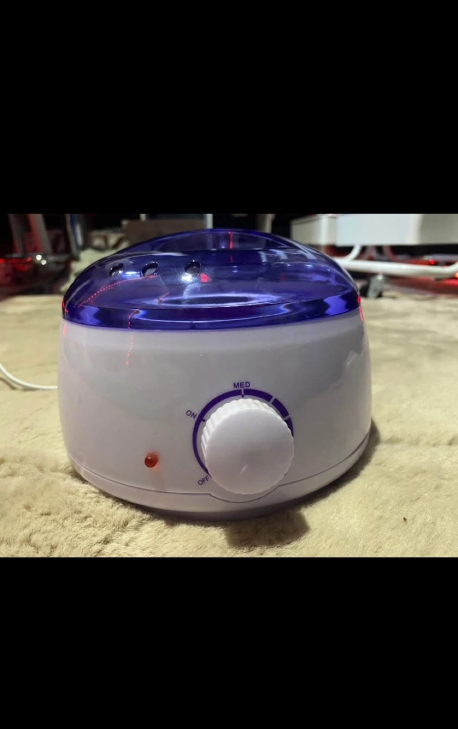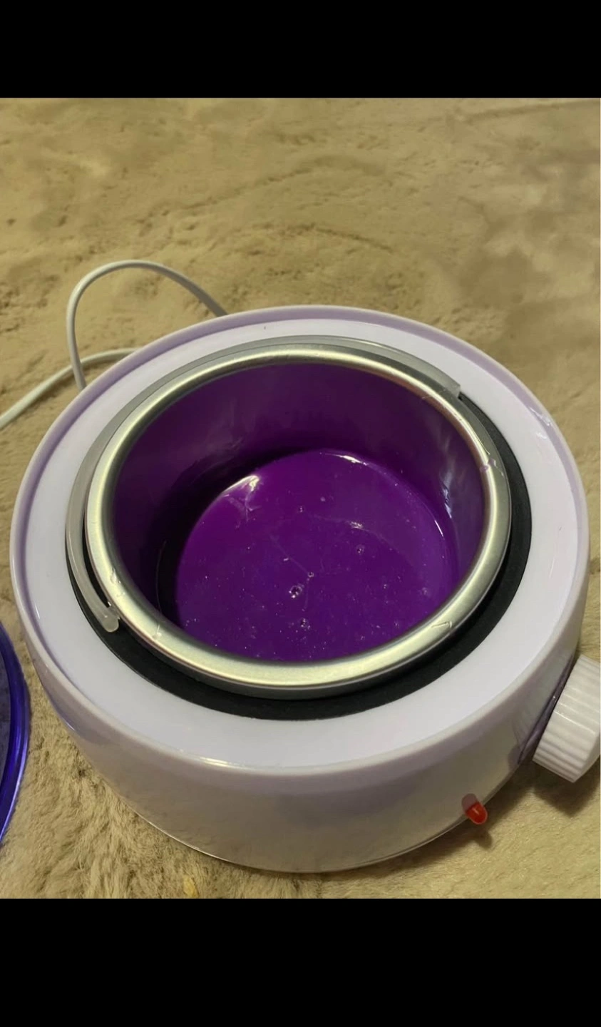 Electric wax warmer. Purple and white. Used. Includes a removable inner pot. Features a dial with on/off and medium settings. Still has wax in it
