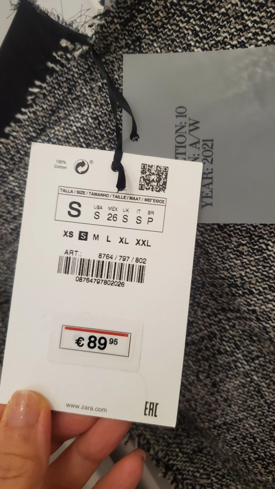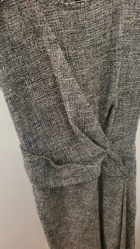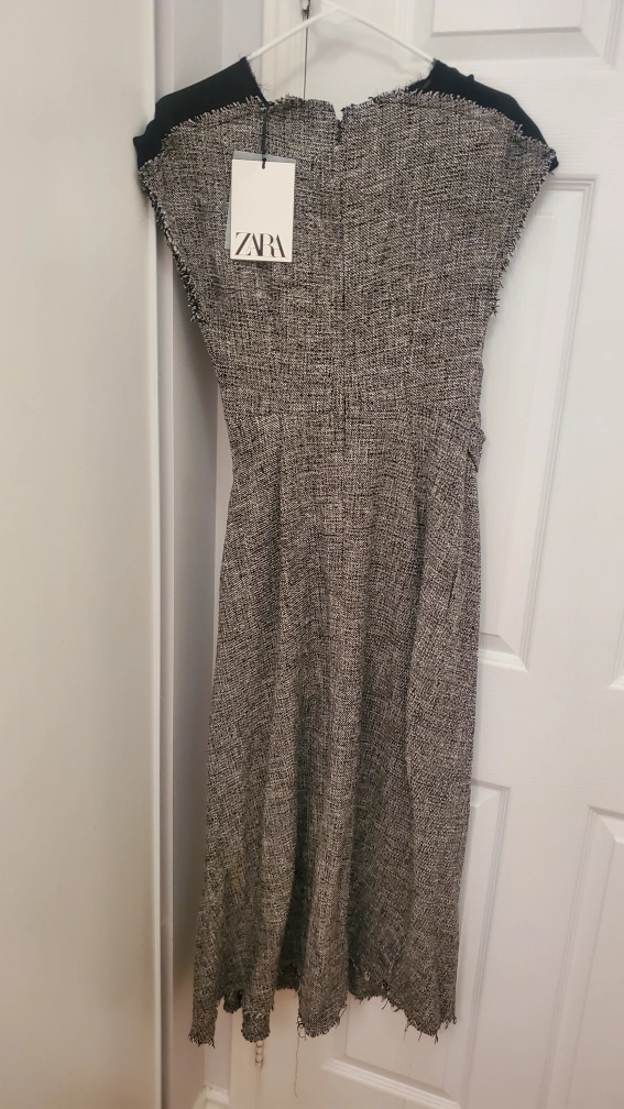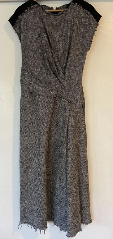 Grey and black tweed dress with a wrap detail at the waist. Sleeveless with a slight ruffle at the neckline. The dress is lined and has pockets on the side. The hem is frayed. new with tag