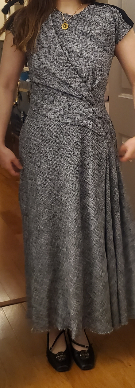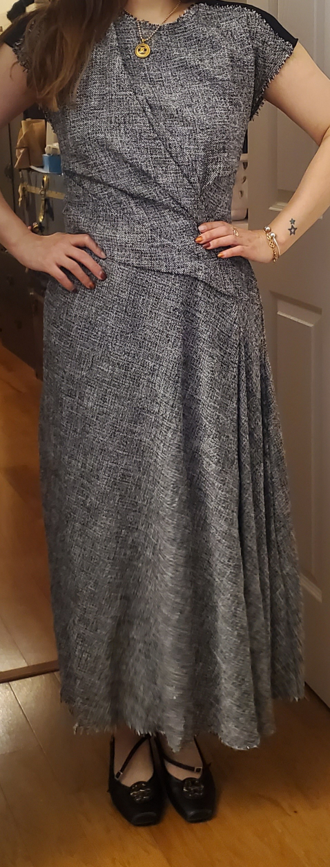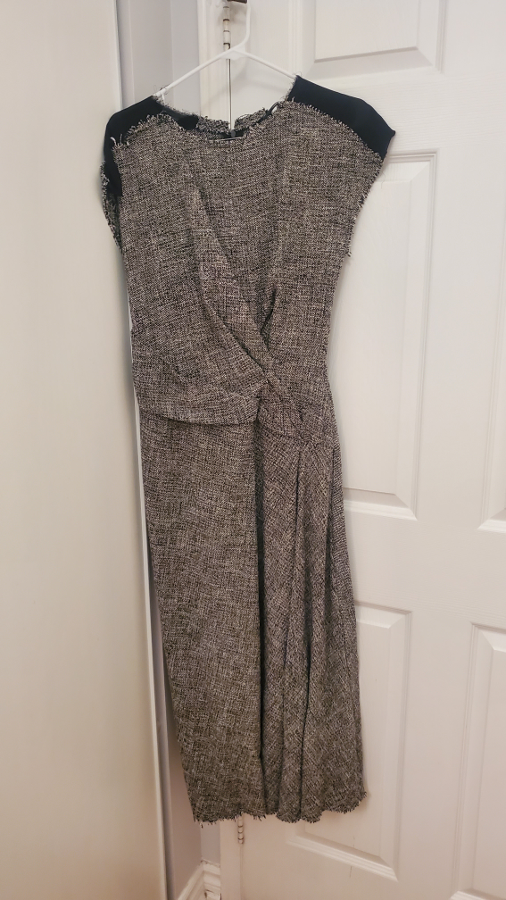 Grey and black tweed dress with a wrap detail at the waist. Sleeveless with a slight ruffle at the neckline. The dress is lined and has pockets on the side. The hem is frayed. new with tag