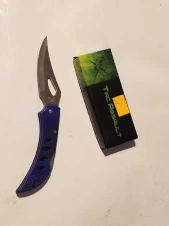 TAC ASSAULT folding knife with blue handle. Includes original box. Blade is approximately 3.5 inches long. brand new many available $11 each