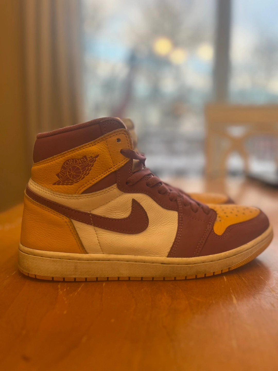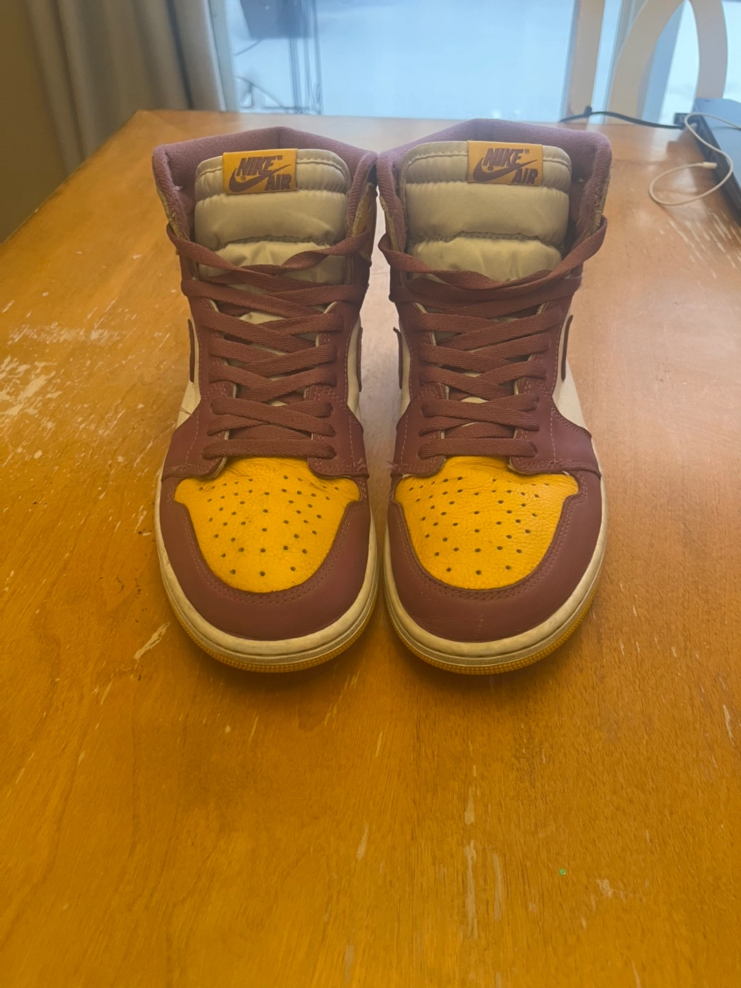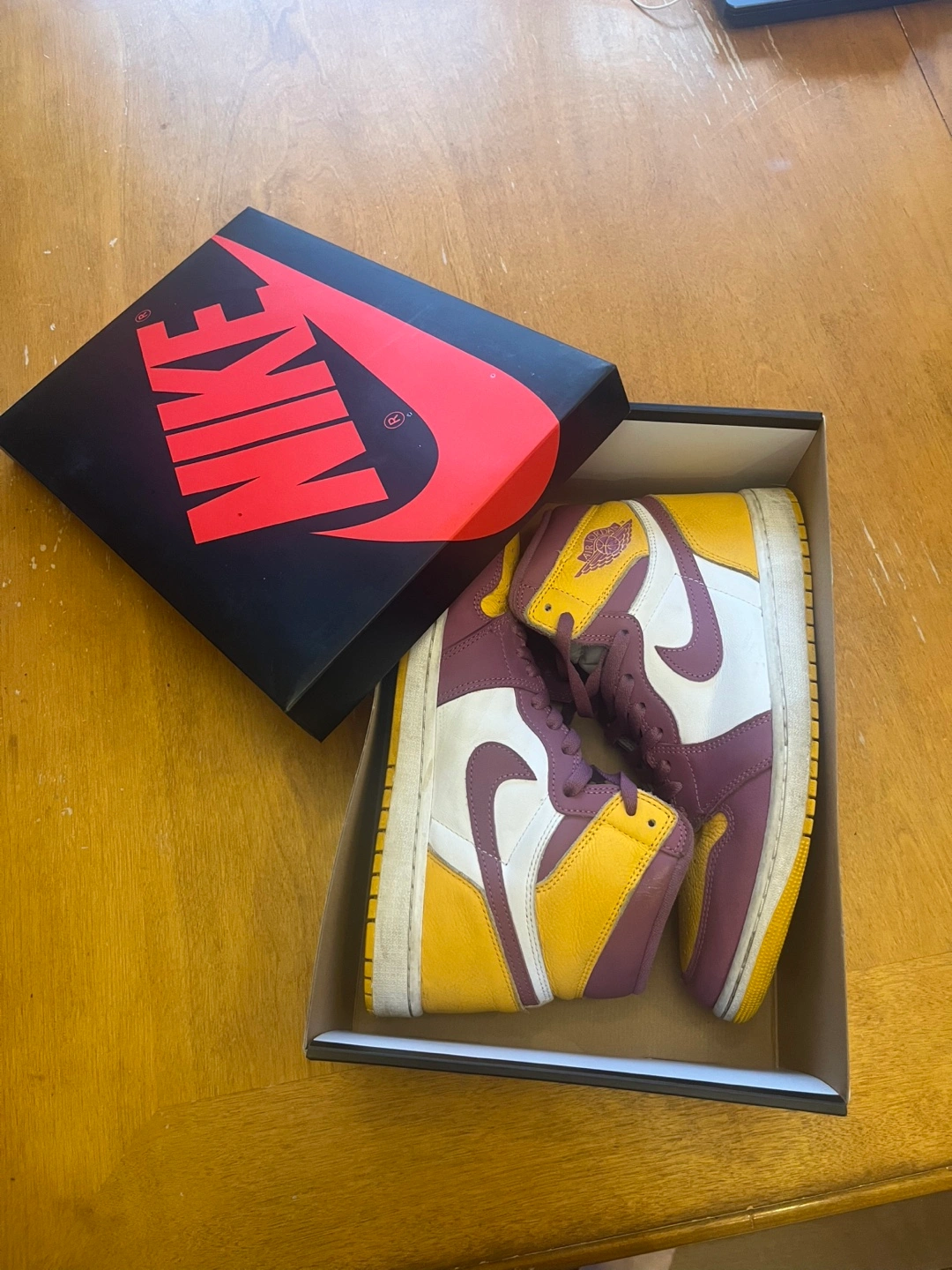 Men's high-top sneakers. Burgundy, gold, and off-white colour scheme. Nike Air branding. Comes with original box.