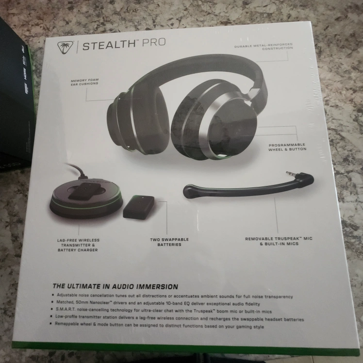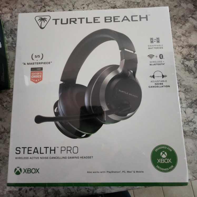 Brand new in box Turtle Beach Stealth Pro wireless gaming headset. Features noise cancellation, swappable batteries, and a comfortable design. Compatible with Xbox, Playstation, PC, and mobile devices. Includes charging dock.