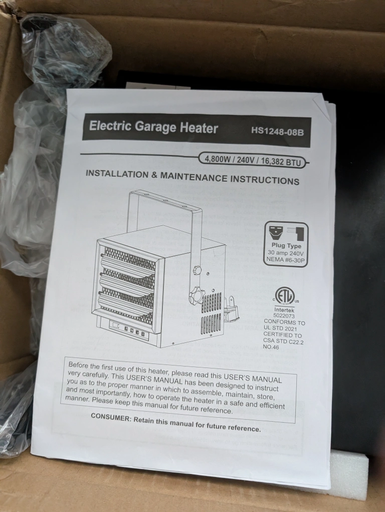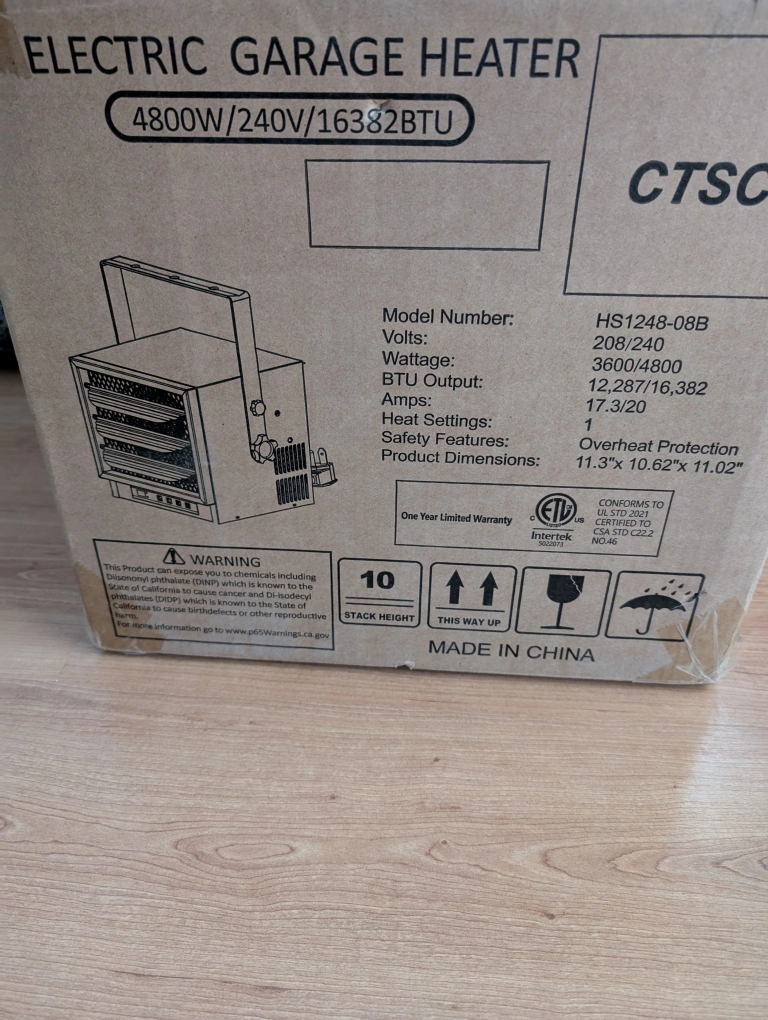 12Garage Heater - Electric Garage Heater, 4800W/240v/60Hz Digital Fan-Forced Ceiling /Wall Mount Shop Heater with Remote and Timer, Workshop Space Heater, Thermostat Control, Overheat Protection, ETL Listed. Sells for $190 online.