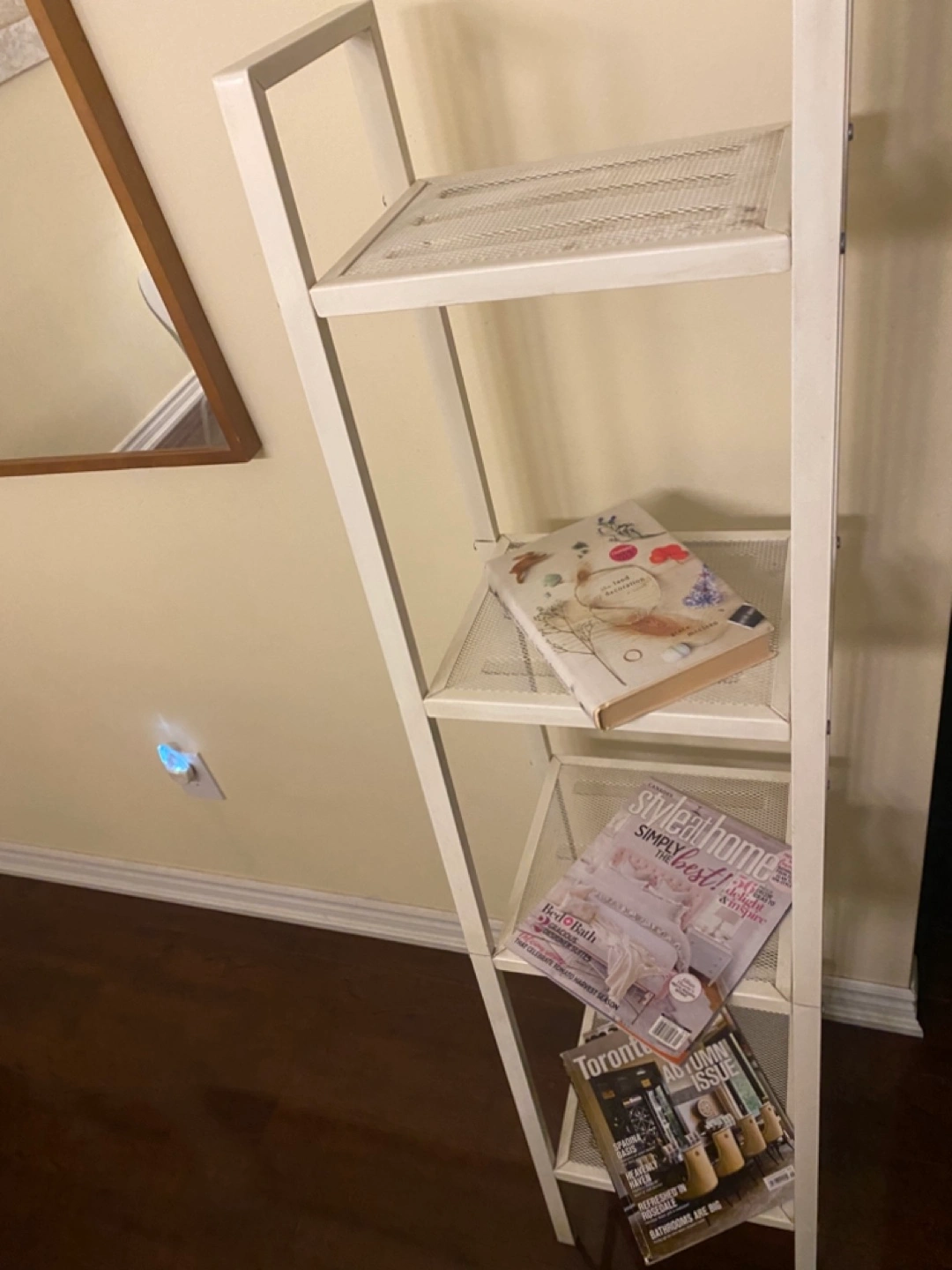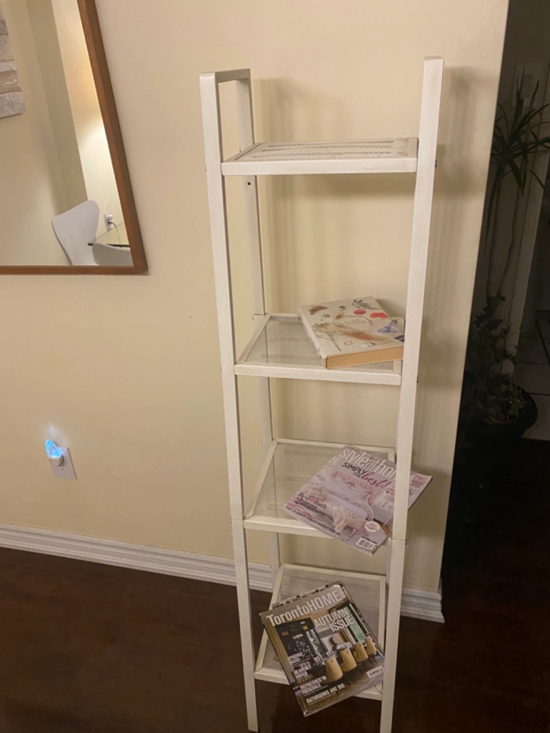 Tall white metal shelving unit. Four shelves with mesh bottoms. Great for storage or display. Minimalist design.