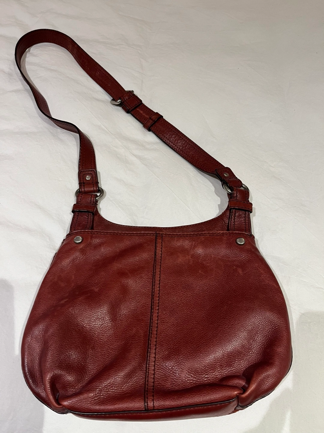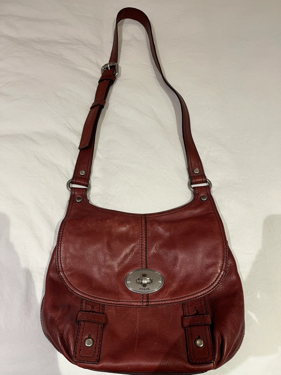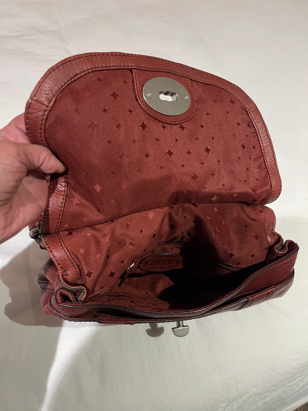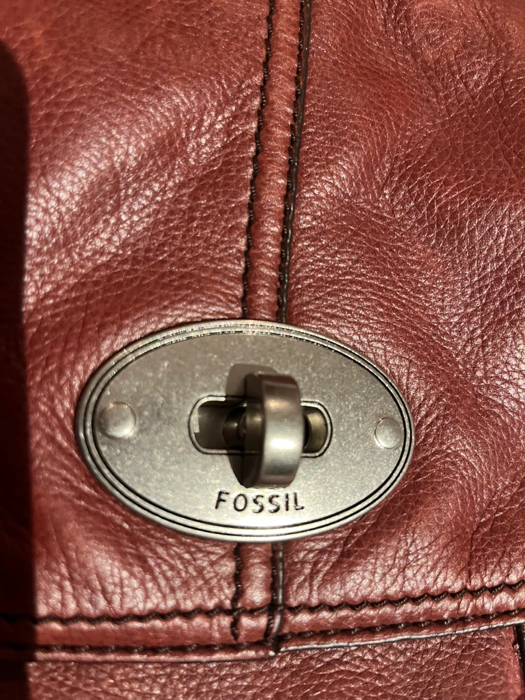 Burgundy leather crossbody bag. Features a flap closure with a signature Fossil clasp. Adjustable shoulder strap. Multiple compartments. In excellent condition.