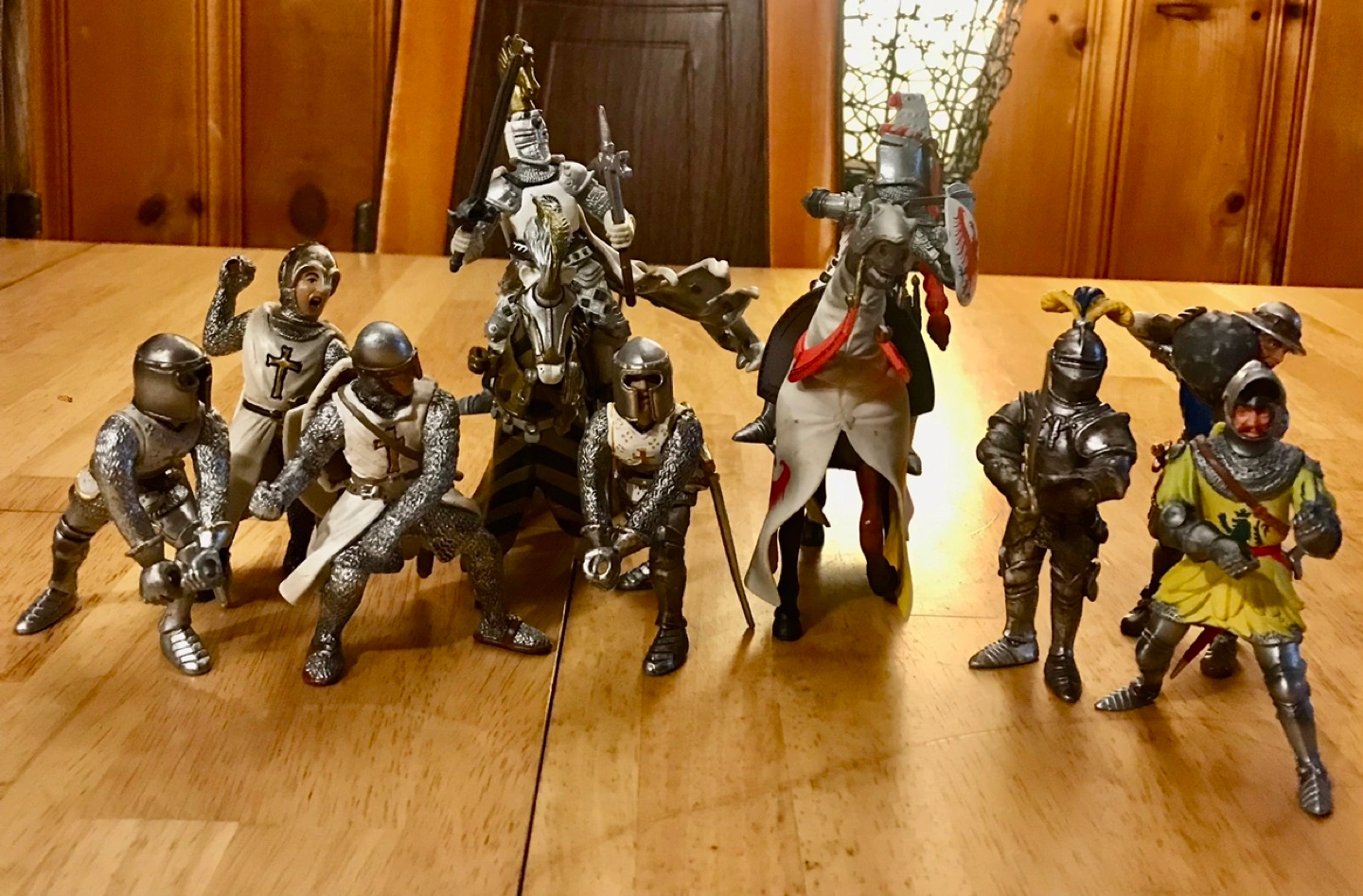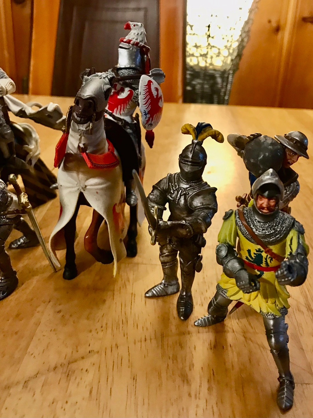 Collection of plastic medieval knight figurines. Includes knights on horseback and foot soldiers. Various poses and colours. Great for imaginative play or collectors.