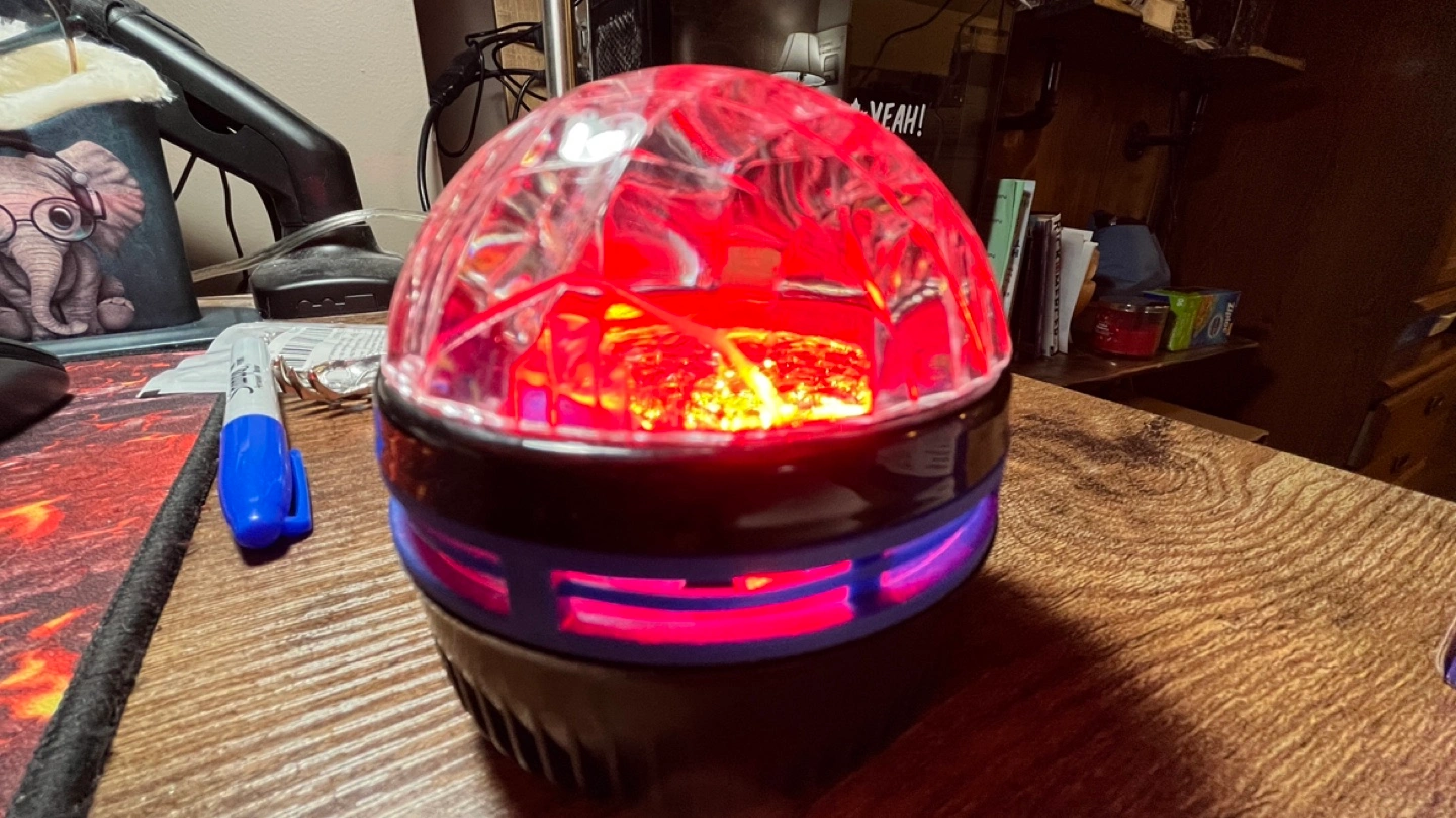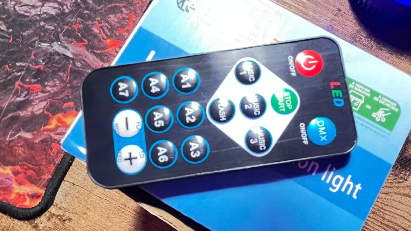 Compact LED projection light. Projects starry patterns onto ceilings and walls. Includes remote control for various light settings. Great for parties or creating a relaxing atmosphere.