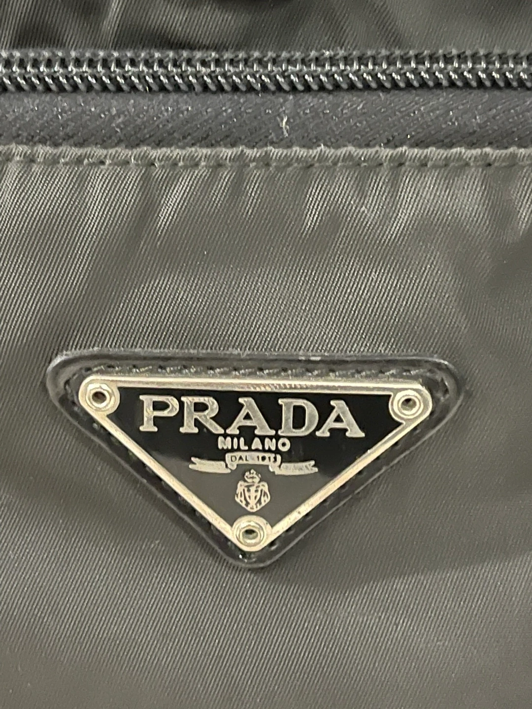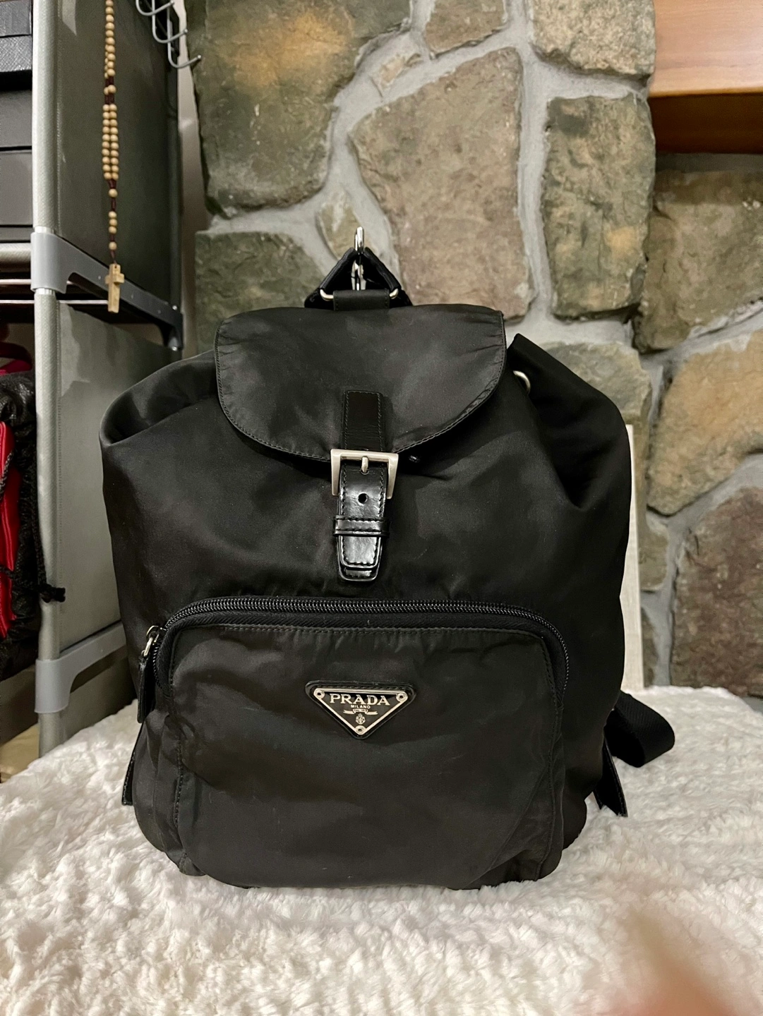 Pre-owned Prada backpack. Black nylon material. Drawstring closure and buckle detail. Interior pockets. Made in Italy. Interior is very clean no foul smell. Comes with dust bag. Pick up in east Maple Ridge