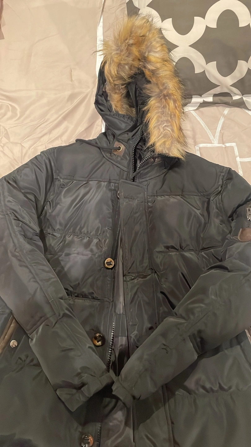 Warm winter parka. Features a fur-lined hood, zipper and button closure, and multiple pockets. Good for cold weather.
