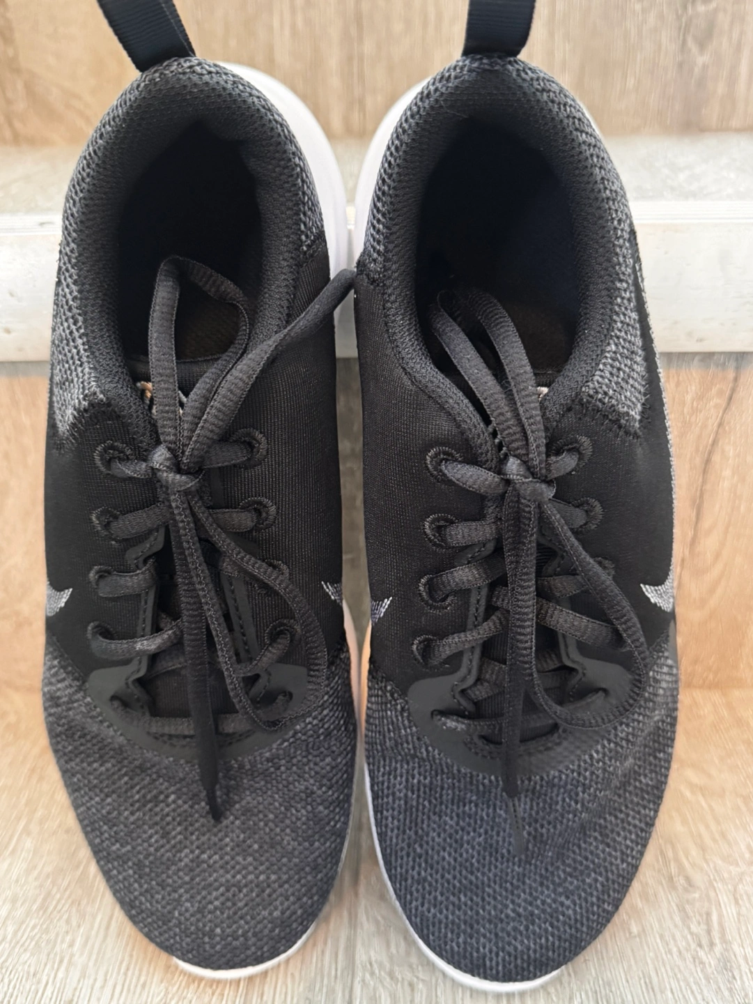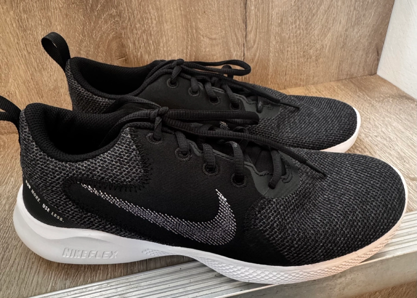 Comfortable running shoes. Black and grey colour scheme. Lightweight and breathable design. Nike branding visible. 'Run More. Use Less.' printed on heel.