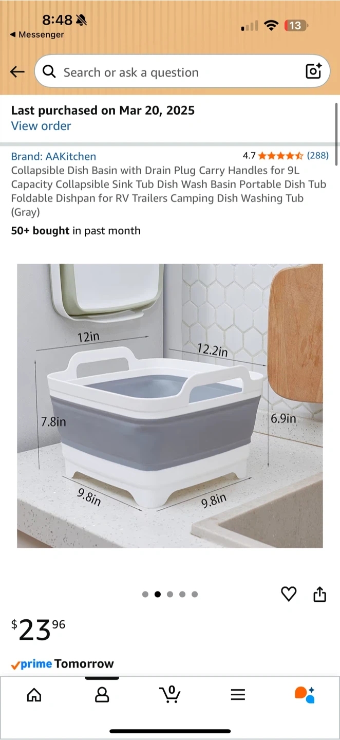 This AAKitchen collapsible dish basin is great for washing dishes. It's a 9L capacity tub with carry handles and a drain plug. Dimensions are 12in x 9.8in x 7.8in when open, and it folds down for easy storage. This portable dish tub is handy for RVs and camping trips!