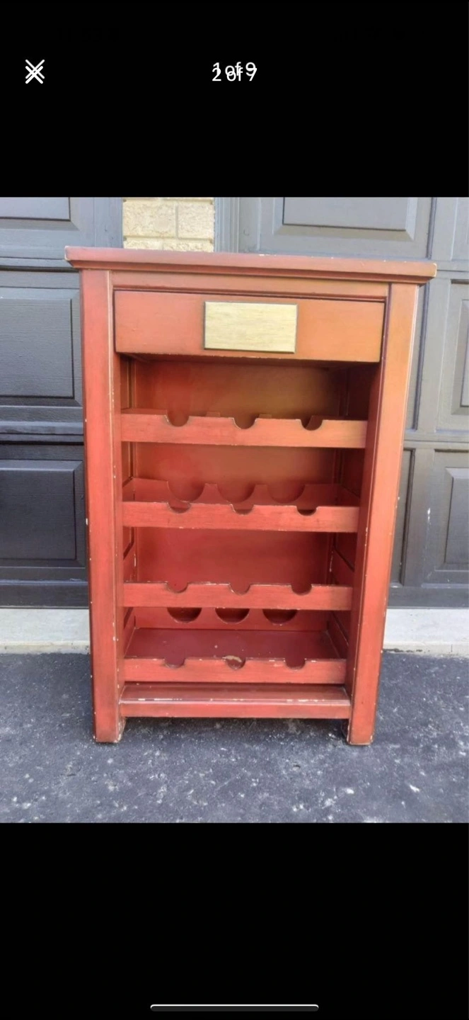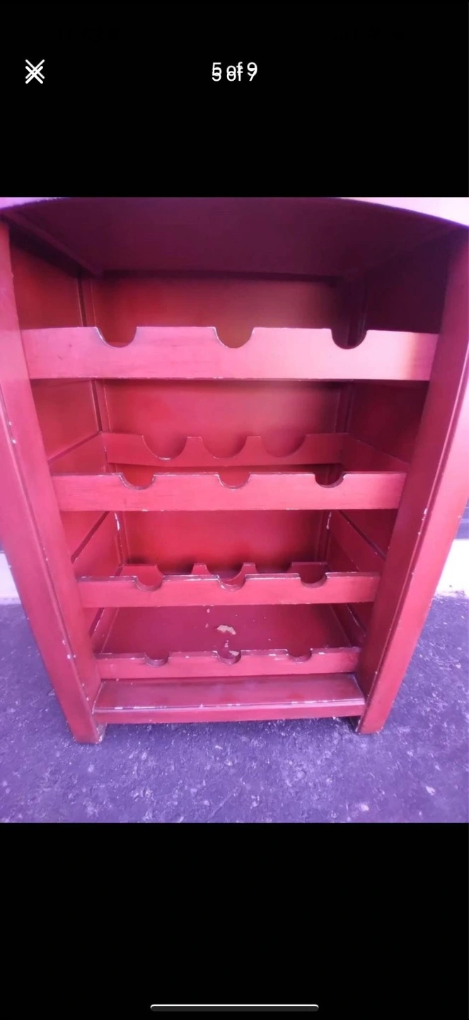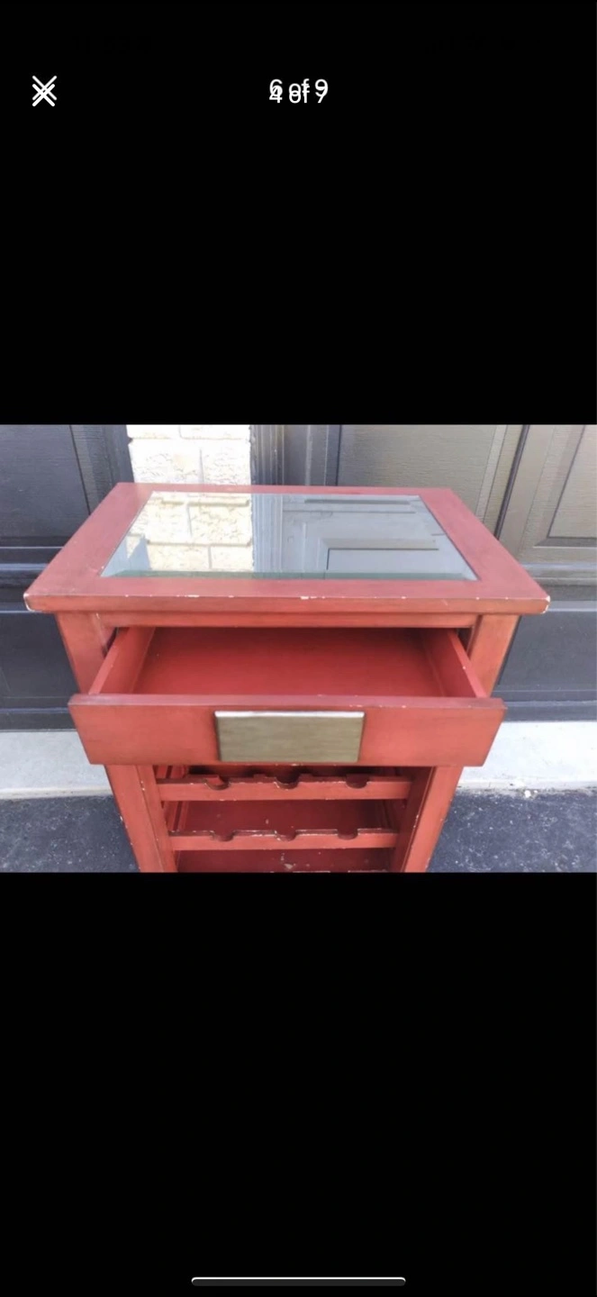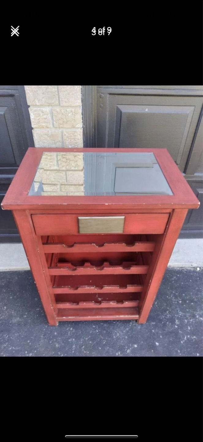Red Vintage Rustic Wine Rack Table With Drawer and Mirrored Top.