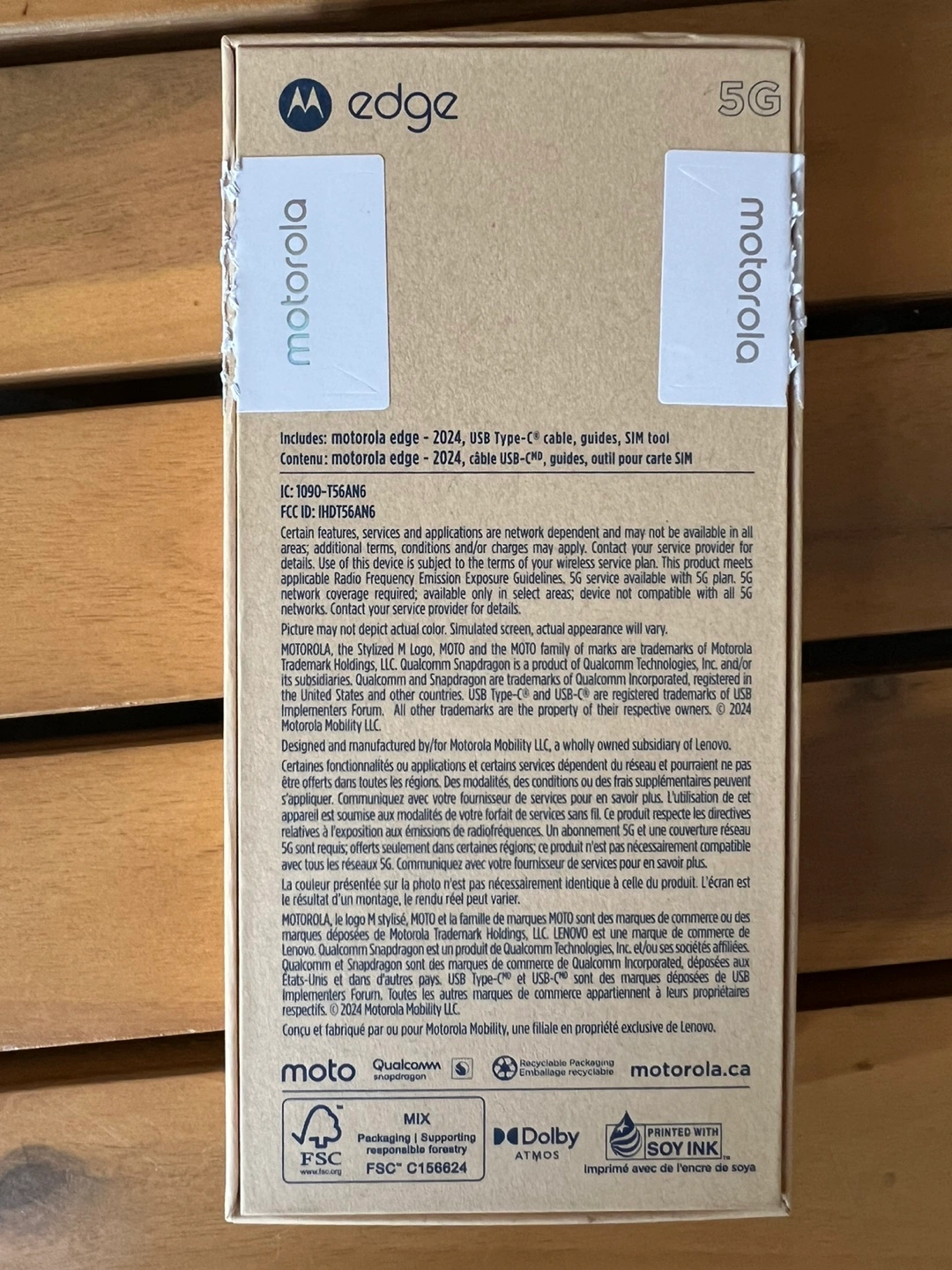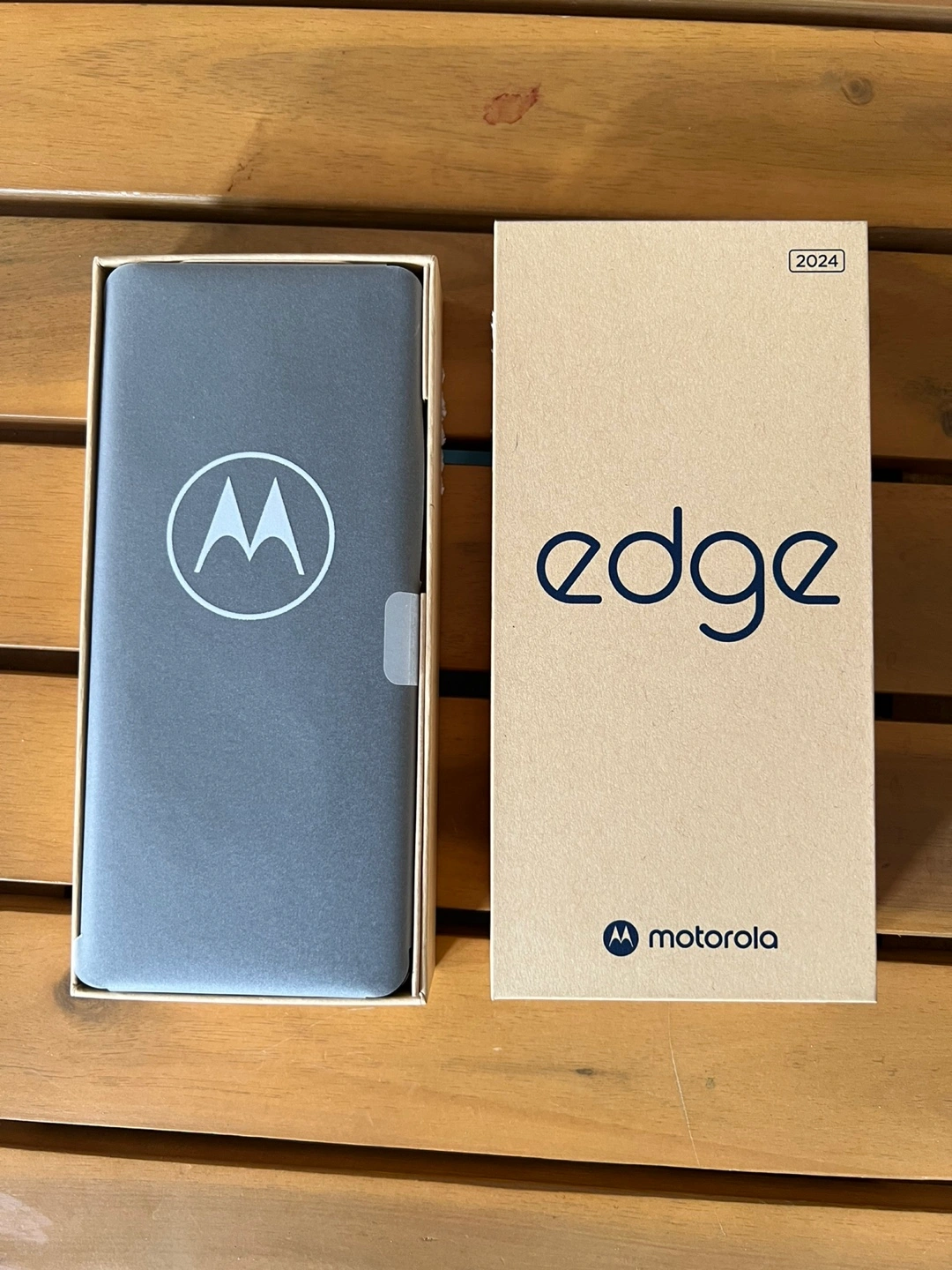 Brand new, unopened Motorola edge (2024) 5G smartphone box. Includes phone, USB-C cable, guides, and SIM tool. 5G capable. Excellent condition.