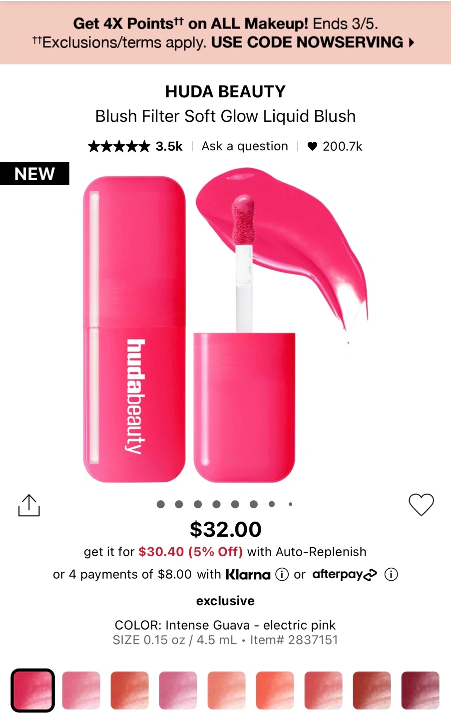 New Huda Beauty liquid blush. Intense Guava shade. Electric pink colour. 0.15 oz / 4.5 mL.