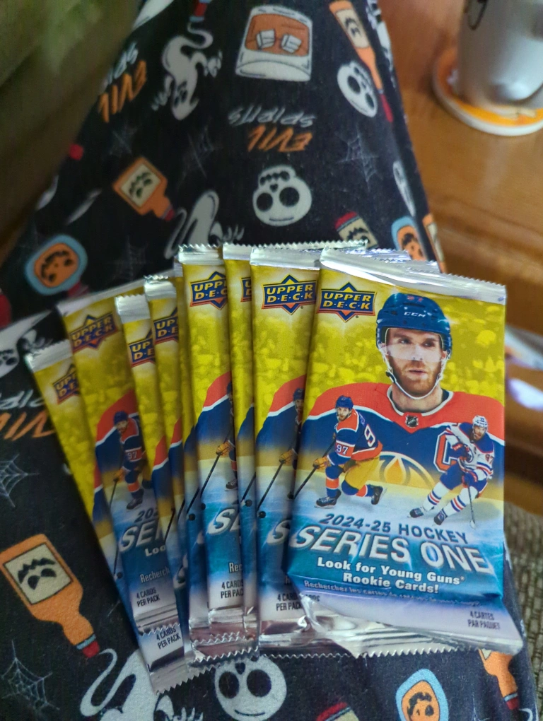 Nine unopened packs of 2024-25 Upper Deck Series One hockey cards. Rookie cards included. Look for young guns!Asking $5 each.Cash or etransfer.Pick up in Oakville.Thank you for looking.