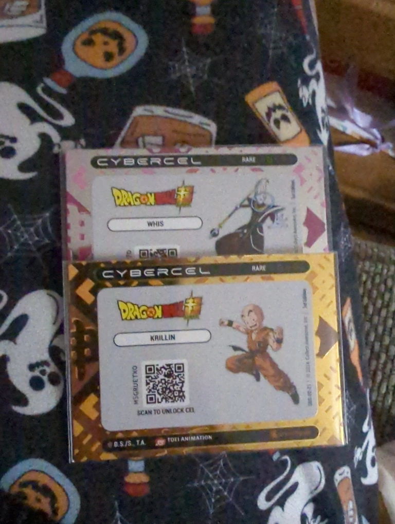 Two rare Dragon Ball Super CyberCell cards. Features Whis and Krillin. Collectible cards in good condition. Scannable QR code.Asking $10 each.Cash or Pick up in Oakville.Thank you for looking.