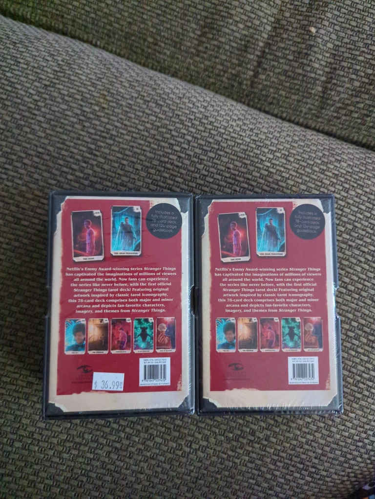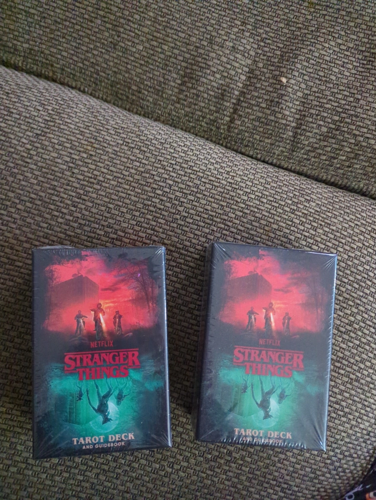 Brand new, sealed Stranger Things tarot decks. Includes 78-card deck and guidebook. Based on the Netflix series. Classic tarot iconography with favourite characters.