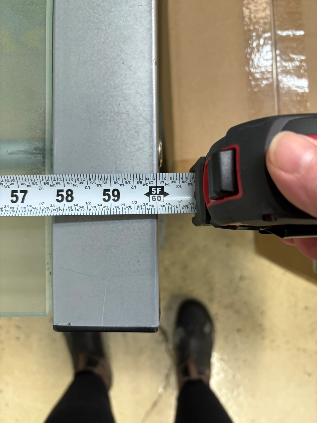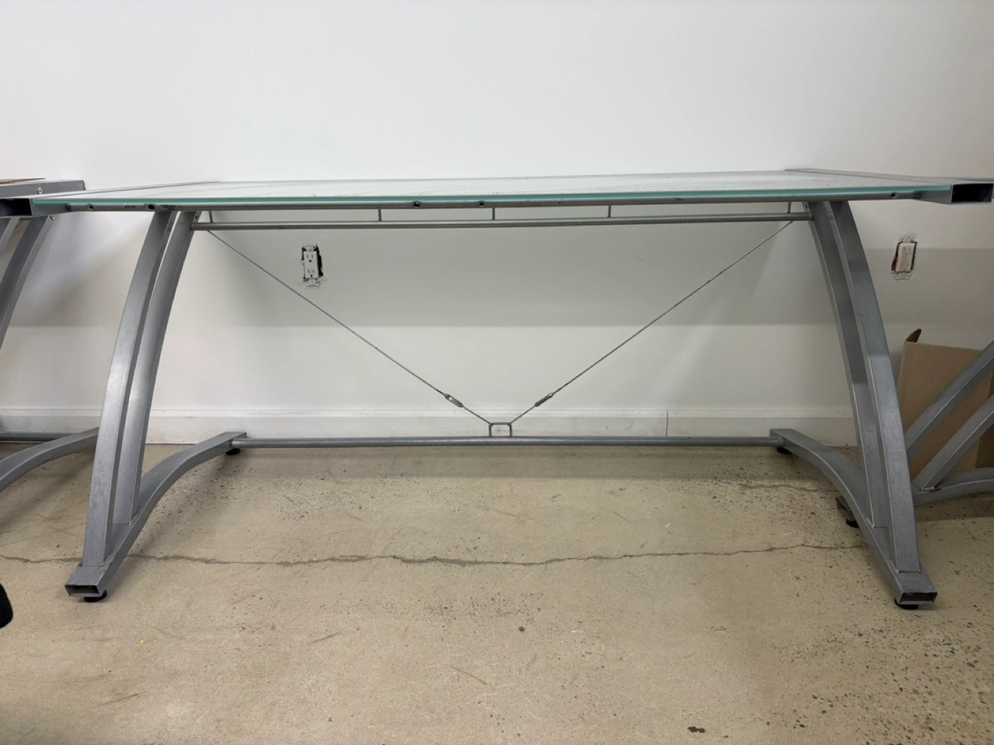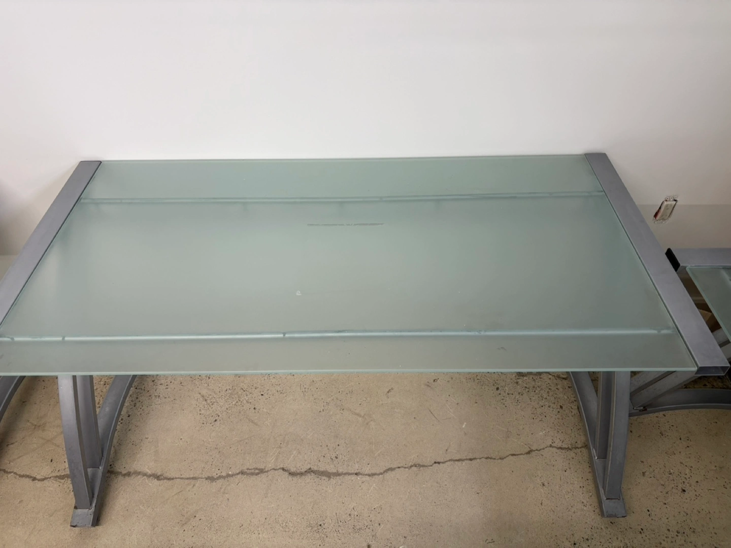 Contemporary style desk/tables. Features a frosted glass top and a brushed silver metal frame. Sturdy construction. Great for home or office use. Approximately 60 inches long.