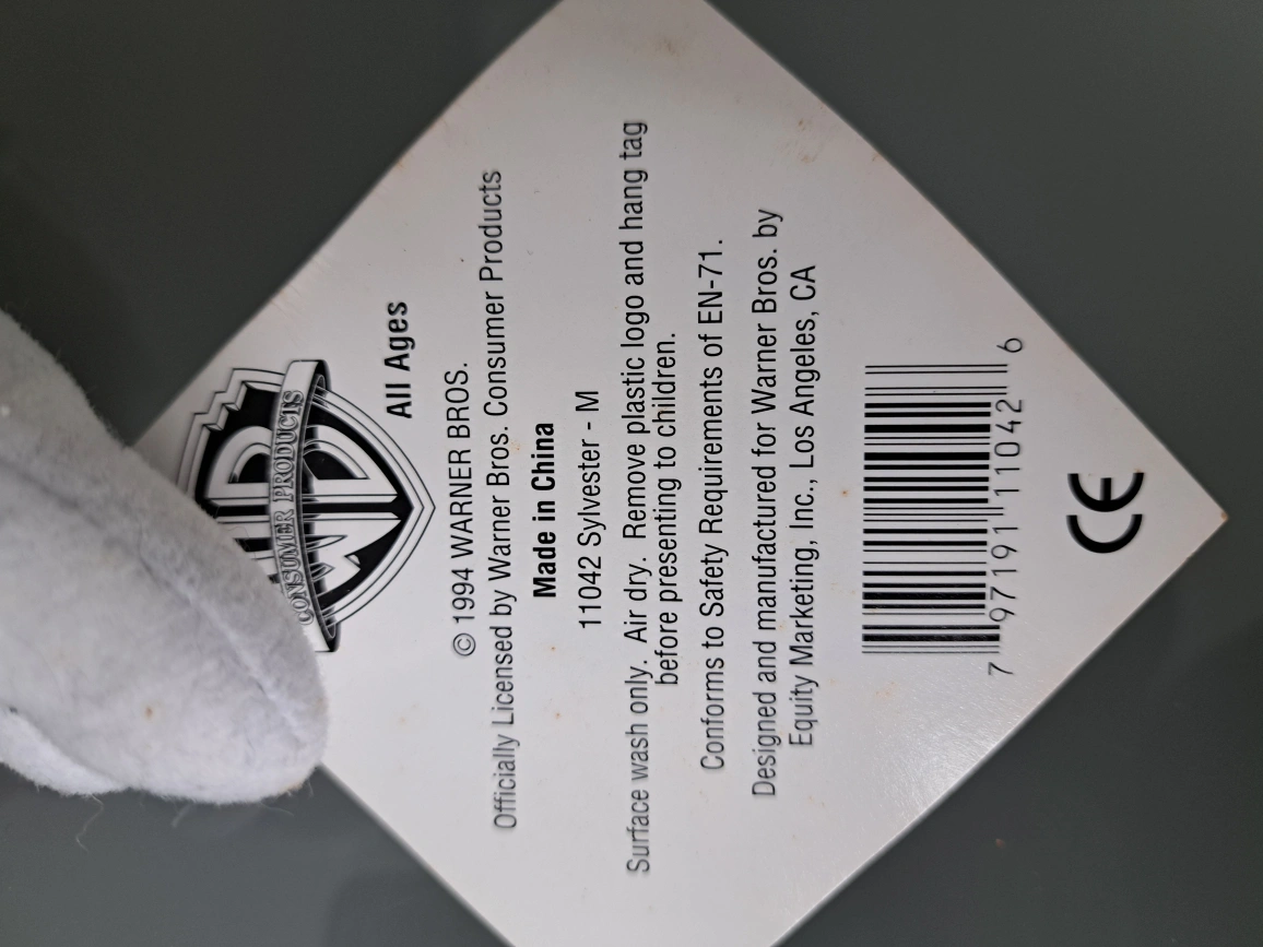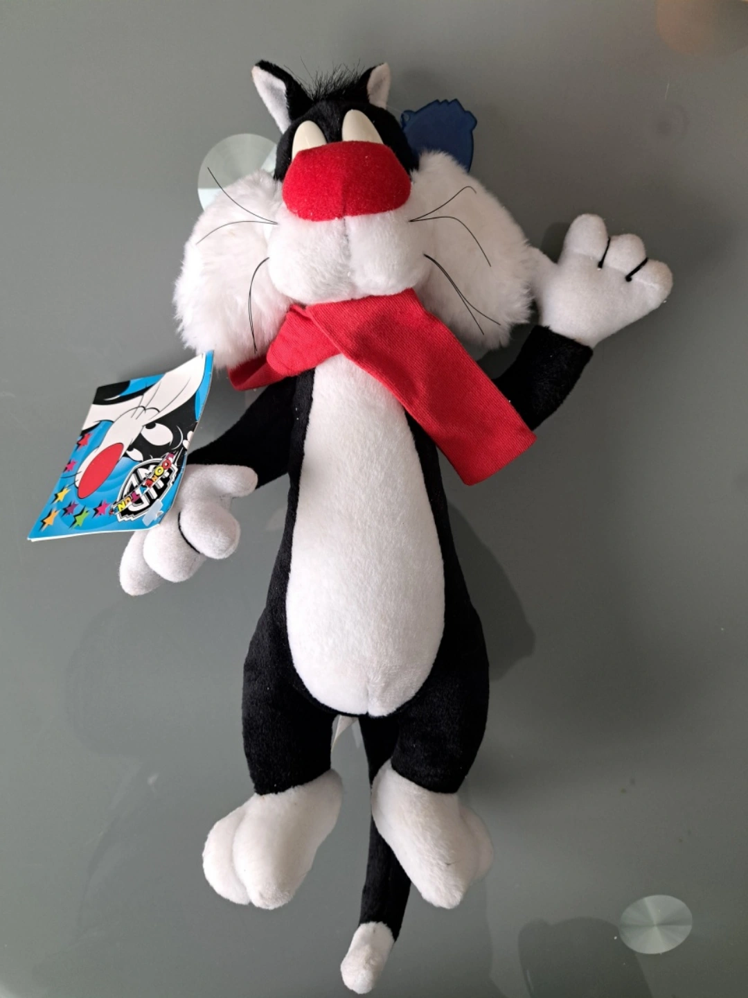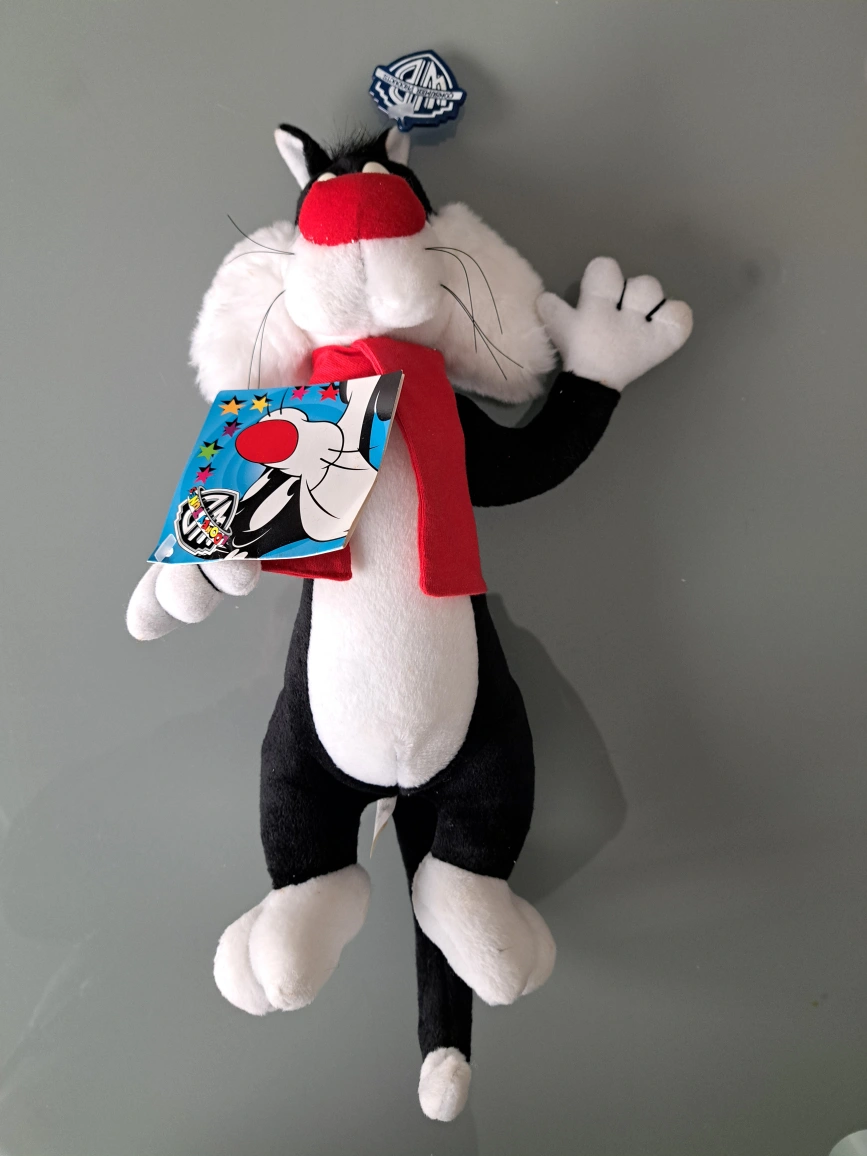 13" Vintage Sylvester plush toy. Black and white cat wearing a red scarf. Good condition. Collectible item. Warner Bros. tag.