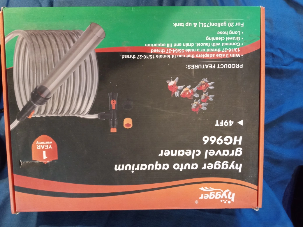 New in box. Auto gravel cleaner for aquariums. For 20 to 50 gallon tanks. Long hose. Connects with faucet. Gravel cleaning. With 2 size adapters: female 15/16-27 thread & male 5/8-27 thread.