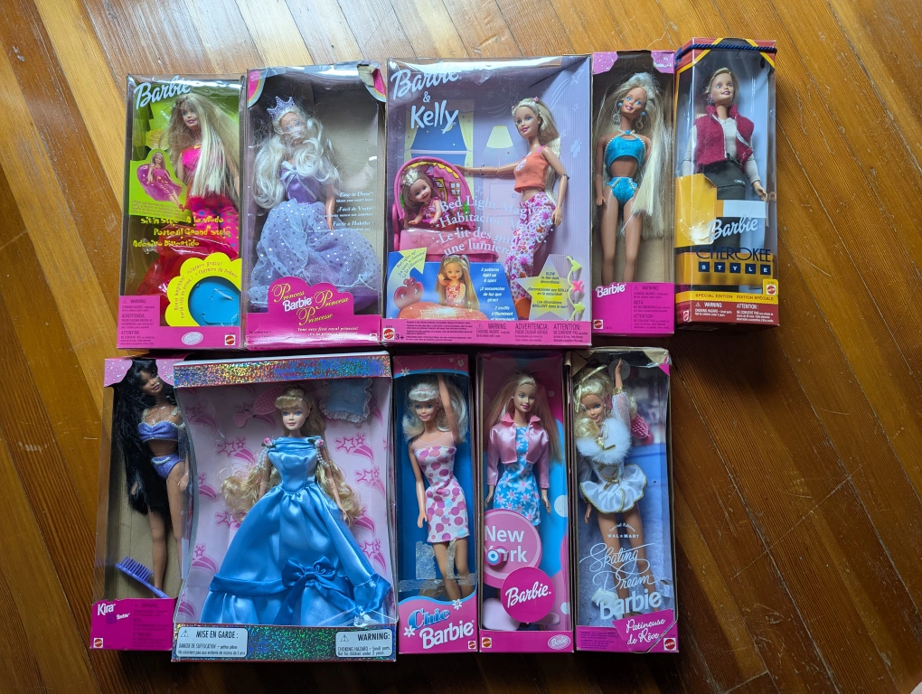 423Collection of 10 vintage Barbie dolls. Includes various outfits and accessories. some have been played with. some have not been played with but the box is damaged.
