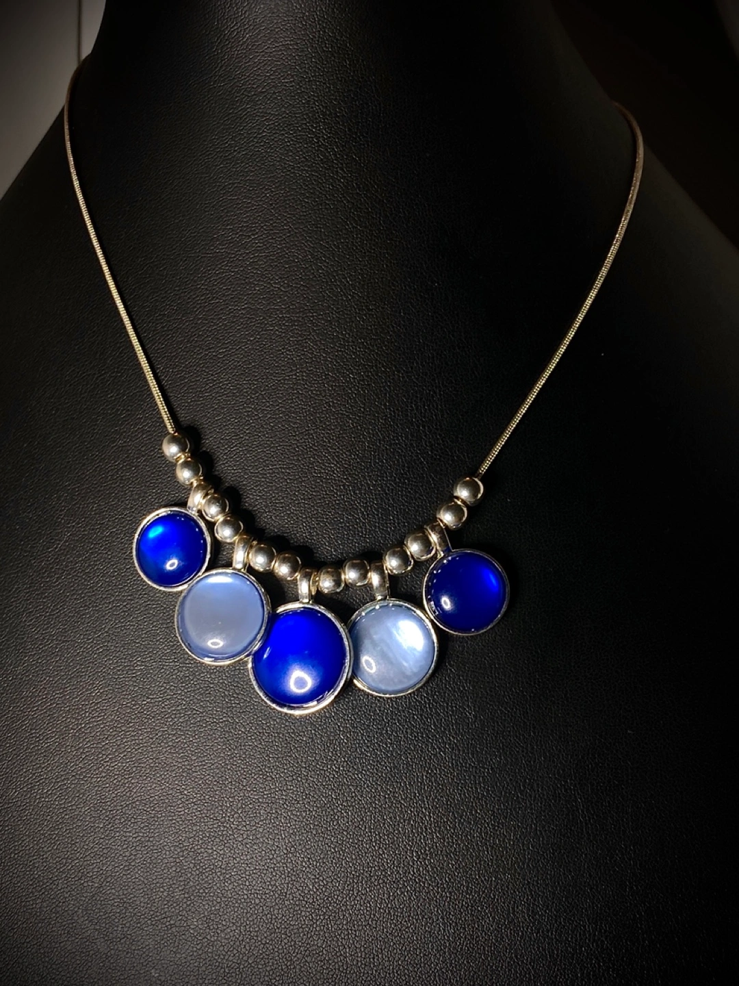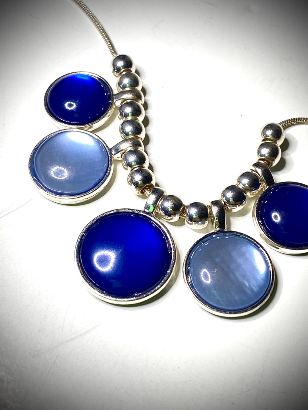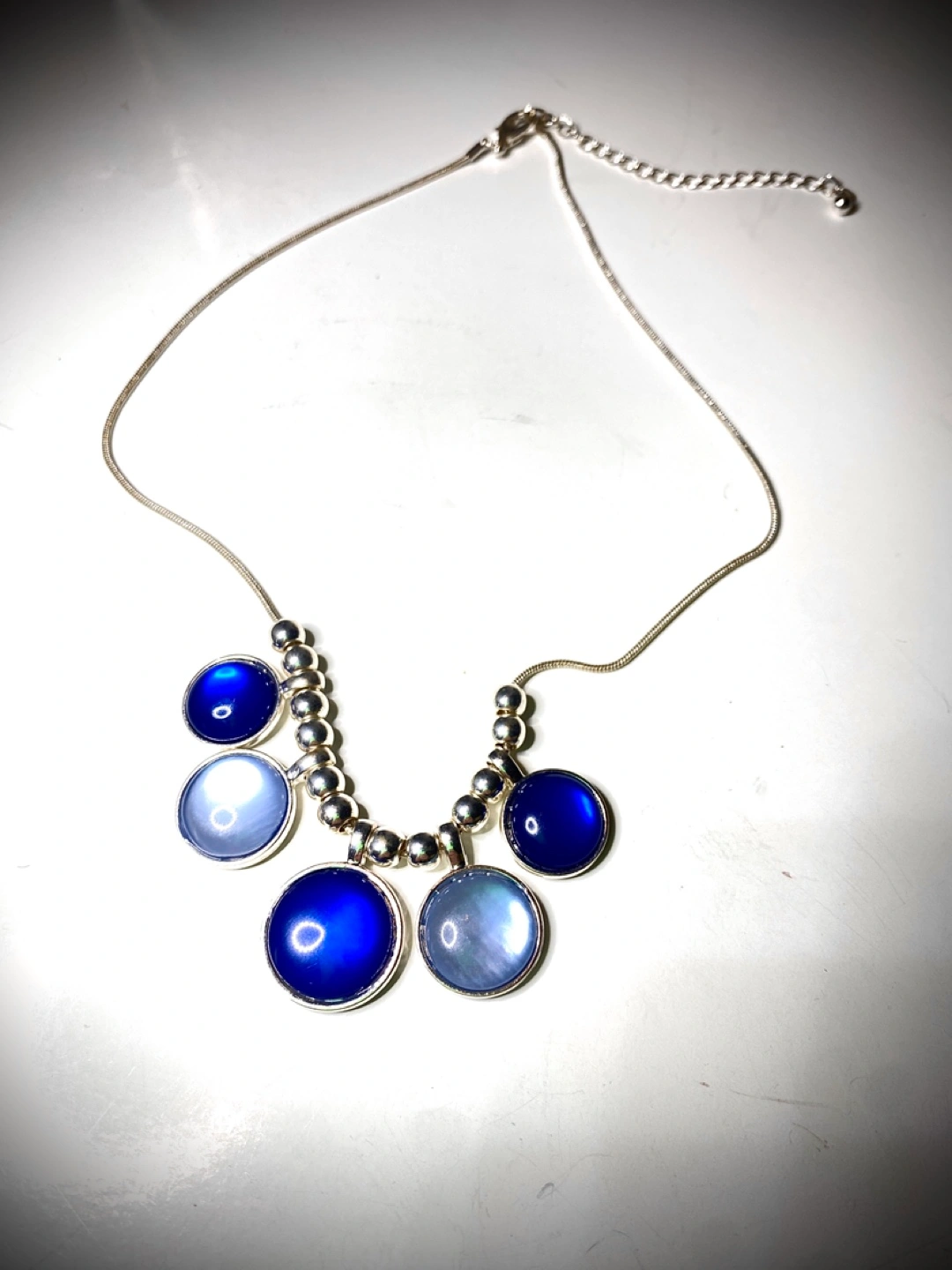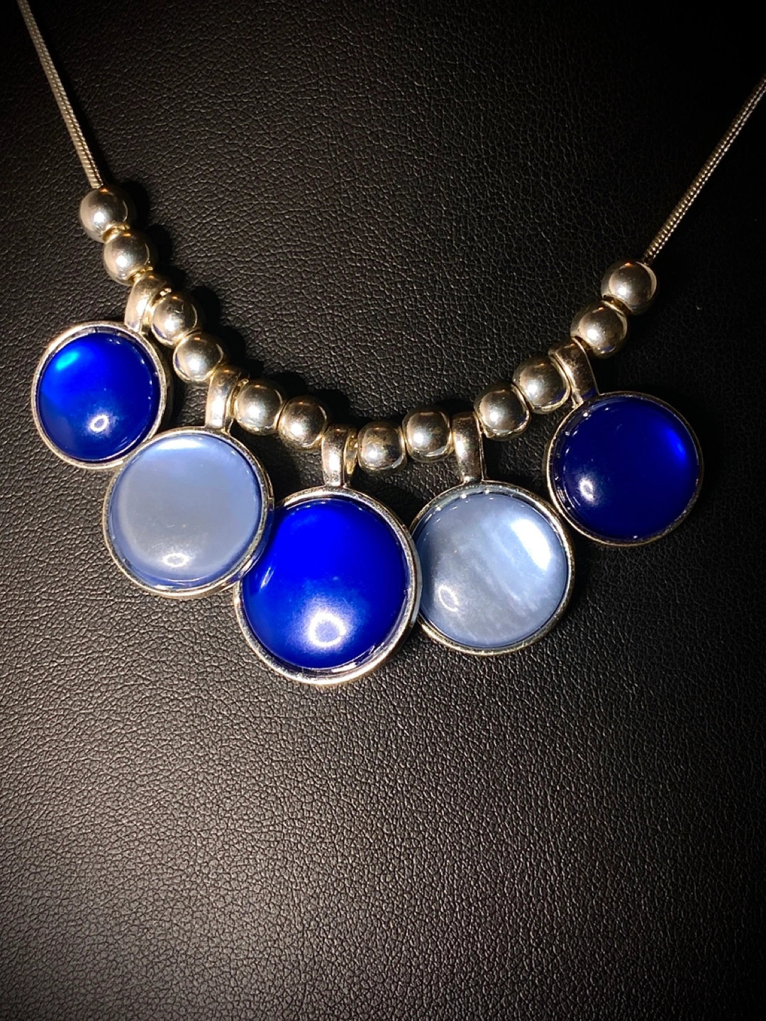 328Stunning necklace with a delicate silver tone chain, small beads, and five round pendants in shades of cobalt blue and cool gray. Perfect for adding a touch of elegance to any outfit. Pickup on Astoria Blvd South and 37th Street.
